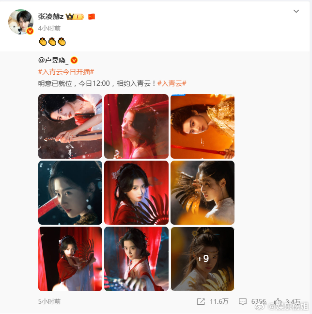 张凌赫宣传卢昱晓入青云卢昱晓新剧《入青云》今日开播,张凌赫转发为其宣传,卢昱晓回
