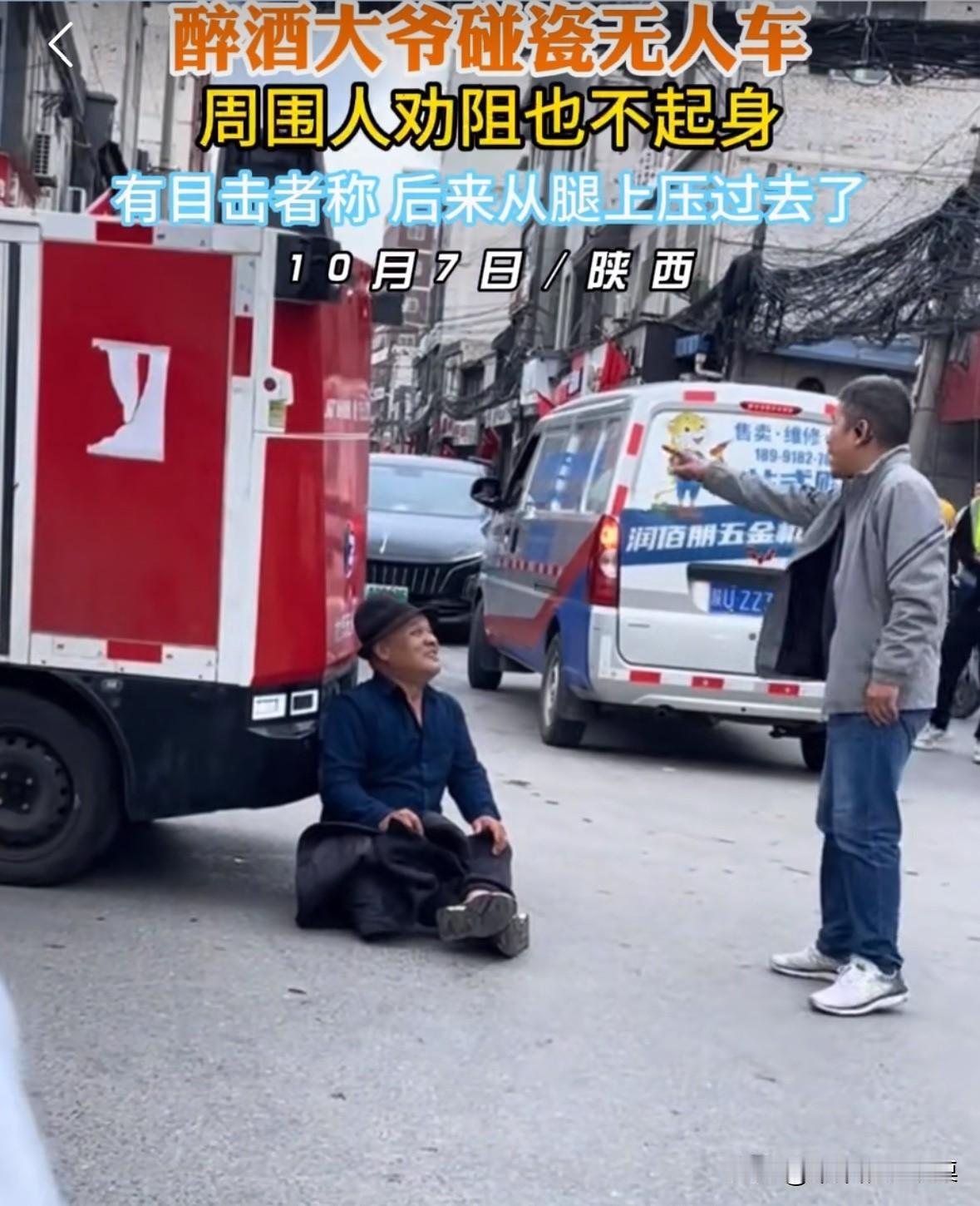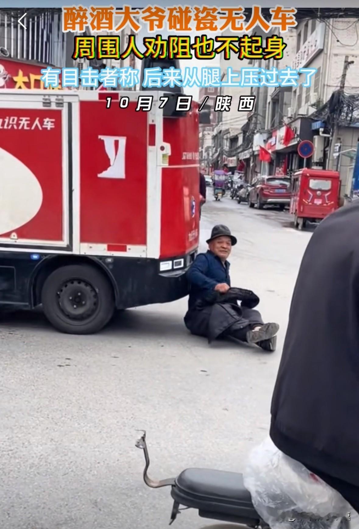 大爷喝醉酒被无人车撞倒,旁边有人劝阻,大爷也坚决不起身。 无人车一直往前撞大爷,
