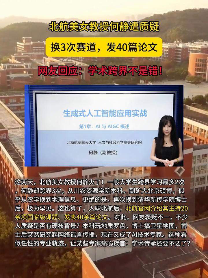 北航美女教授何静遭质疑,换3次赛道,发40篇论文。网友回应:学术跨界不是错! 北京航空航天大学人文与社会科学高等研究院何静(副教授)。 这两天,北航美女教授何静火了!一般大学生跨界学习最多2次,何静却跨界3次,从川农资源学院本科,到矿大北京硕博,似乎从农学换到地理信息,更绝的是,再次换到清华新传学院博士后,极为罕见。这也算了,入职北航后,北航官网介绍其主持20余项国家级课题、发表40余篇论文。 对此,网友褒贬不一,不少人质疑是否有硬核背景?本科玩地质罗盘,博士搞卫星地图,博士后突然研究起网络谣言传播,现在又成了AI技术专家。这种看似任性的专业轨迹,让某些专家痛心疾首:学术传承还要不要了?专家不是反对何静,是害怕年轻人发现原来学术可以这么好玩。