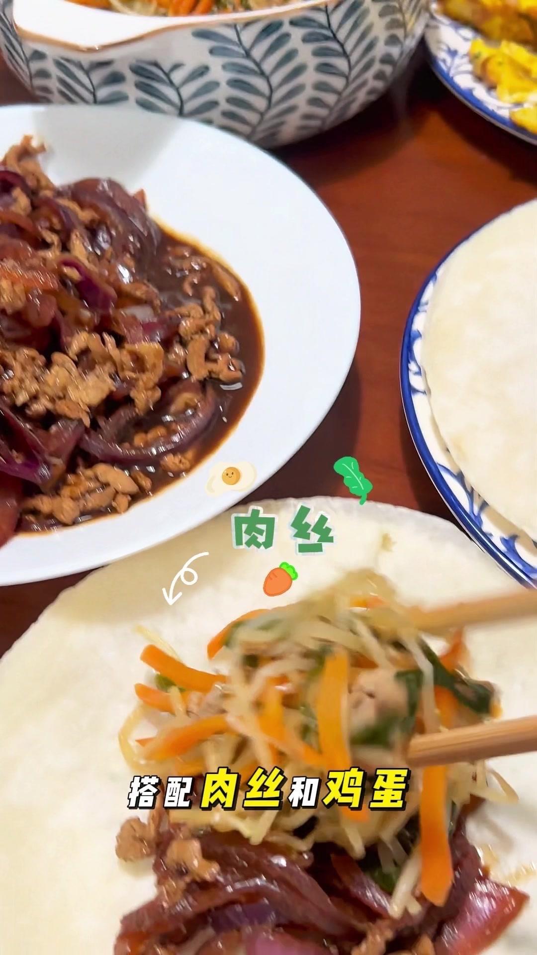 🍳秋天容易上火,过节后给孩子做春饼太合适了!薄薄的饼皮裹满蔬菜和肉丝,一口下去超满足,一次能吃好几张。 1️⃣备菜处理:准备豆芽菜、洋葱、大葱、韭菜、鸡蛋、胡萝卜、肉丝这些家常食材。肉丝提前用酱油和醋腌制,炒到八成熟后盛出备用,接着炒洋葱丝加蚝油、甜面酱,北方孩子应该都喜欢这个味道~ 2️⃣炒制小菜:再依次将胡萝卜丝、韭菜翻炒,加入之前炒好的肉丝,加少许酱油和蚝油调味,简单翻炒就熟了。最后做个葱花鸡蛋,一道香喷喷的卷饼小菜就齐活了。 虽说叫春饼,但其实什么时候都能吃。选孩子爱吃的蔬菜搭配肉丝和鸡蛋,做法简单,家里人吃着也健康美味。