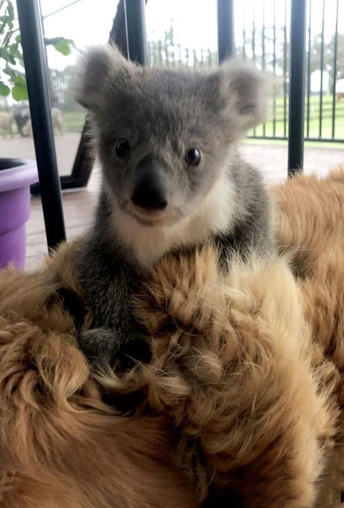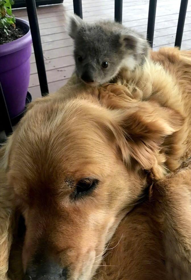 大金毛救了一只小考拉, 主人早上起来发现金毛背上驮着一只小考拉,怀疑是从树上掉下来的。如果金毛没有发现并驮回家的话(或者小考拉没有爬上金毛的背并抓着不放的话),小考拉很有可能就被狐狸之类的叼走了。小考拉已经送到考拉救助机构。 驮在背上也太像驮了个玩具了吧!