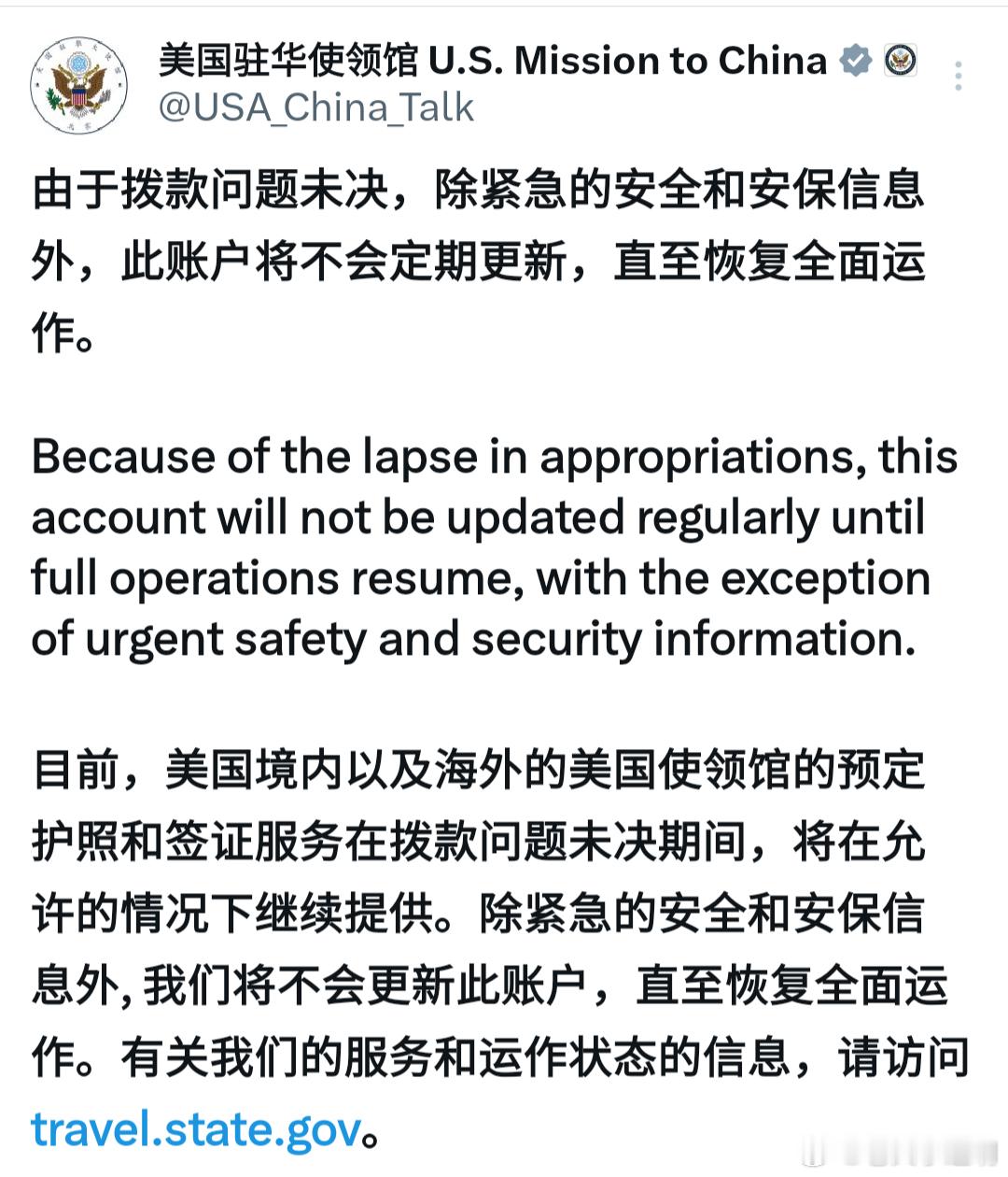 美驻华大使馆宣布微博微信停更凡是美国财政支撑的官方账号,都可以借美国政府停摆的名义,停止更新真正美国政府重新开门。《美国之音》在美国政府宣布关门的第二天,就跟着宣布停更了。美国驻华使领馆在X上官方账号,在10月3日就已宣布“不会定期更新”。网络账号停更无所谓,不会拖欠咱们的水电气费用吧?