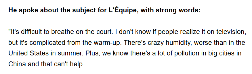 我问题还没问完,他就神色严肃地开口回答了:“我第二天就给这位记者打电话了,我非常愤怒。采访过程中他一直push我说一些话,比如很潮湿很热啊,我说确实很湿热;他说,而且空气污染肯定让事情更严重吧——我说也许吧。我的意思是,全世界的大城市都有一定程度的空气污染,无论是巴黎、伦敦还是纽约。上海不可能是0污染,正如巴黎也不可能是0污染一样。”