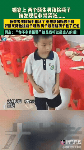 重庆,两个小男孩在婚宴上捡瓶子,然后被男子发现了,他们就表现的非常紧张,让男子意