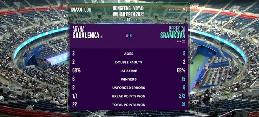 萨巴伦卡不会曝出本届武网最大的冷门吧,据说对面的斯拉姆科亚实力也是不可小觑的,去年就战胜过巅峰期的郑钦文。 这是萨巴伦卡在本届武网的第一场比赛,目前大比分0:1落后。赛后的数据统计显示,萨巴伦卡在所有数据上都是落后的,可见她今天状态不是很好,而反观对手,今天状态还是非常不错的。 看看斯拉姆科娃今天能不能完成爆冷击败世界第一的壮举?