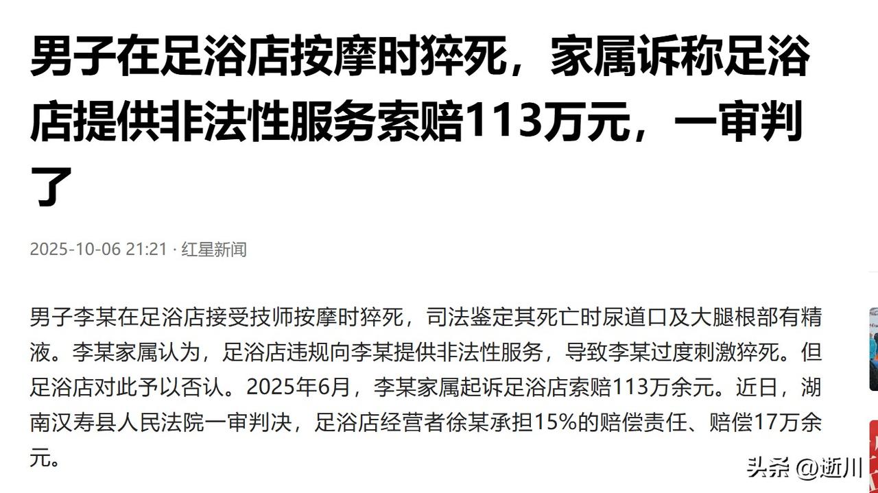 小编发现,近期男子李某某在足浴店接受女按摩技师服务时,因兴奋过度死亡。因发现其尿道口和大腿根部有精液,家属认为该店🏬违规提供性服务,才导致死亡⚱️的根本原因,要求赔偿113万元。 针对此事,一审判决湖南汉寿县人民法院判决,足浴店承担15%的责任,赔偿15万。针对此事,大家怎么看?