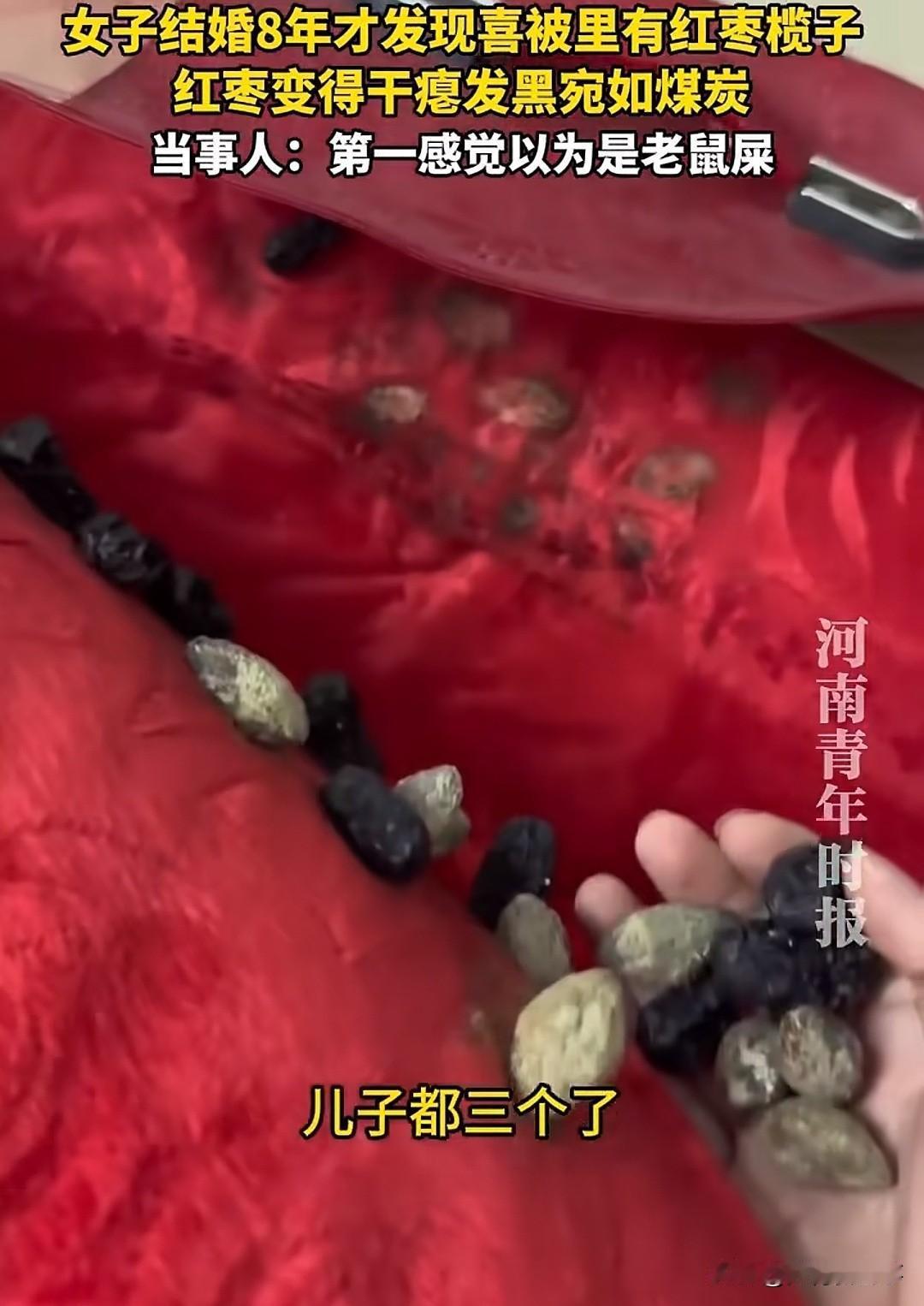 “结婚8年的喜被里掏出一堆黑黢黢的‘疙瘩’,广东刘女士差点吓一跳:这不会是老鼠在里面做窝了吧?结果凑近一看,竟是结婚时家人偷偷塞的红枣、橄榄,都干瘪发黑了! 你说这家人多有心,把‘早生贵子’的祝福藏在喜被里,一藏就是8年。要不是这次国庆回老家翻出来,这份沉甸甸的心意还不知道要藏到啥时候呢!就这家人的这份用心,谁看了不觉得心里暖暖的? 你们结婚时家里有啥特别的传统讲究不?来聊聊你收到过最特别的婚礼祝福呗~”
