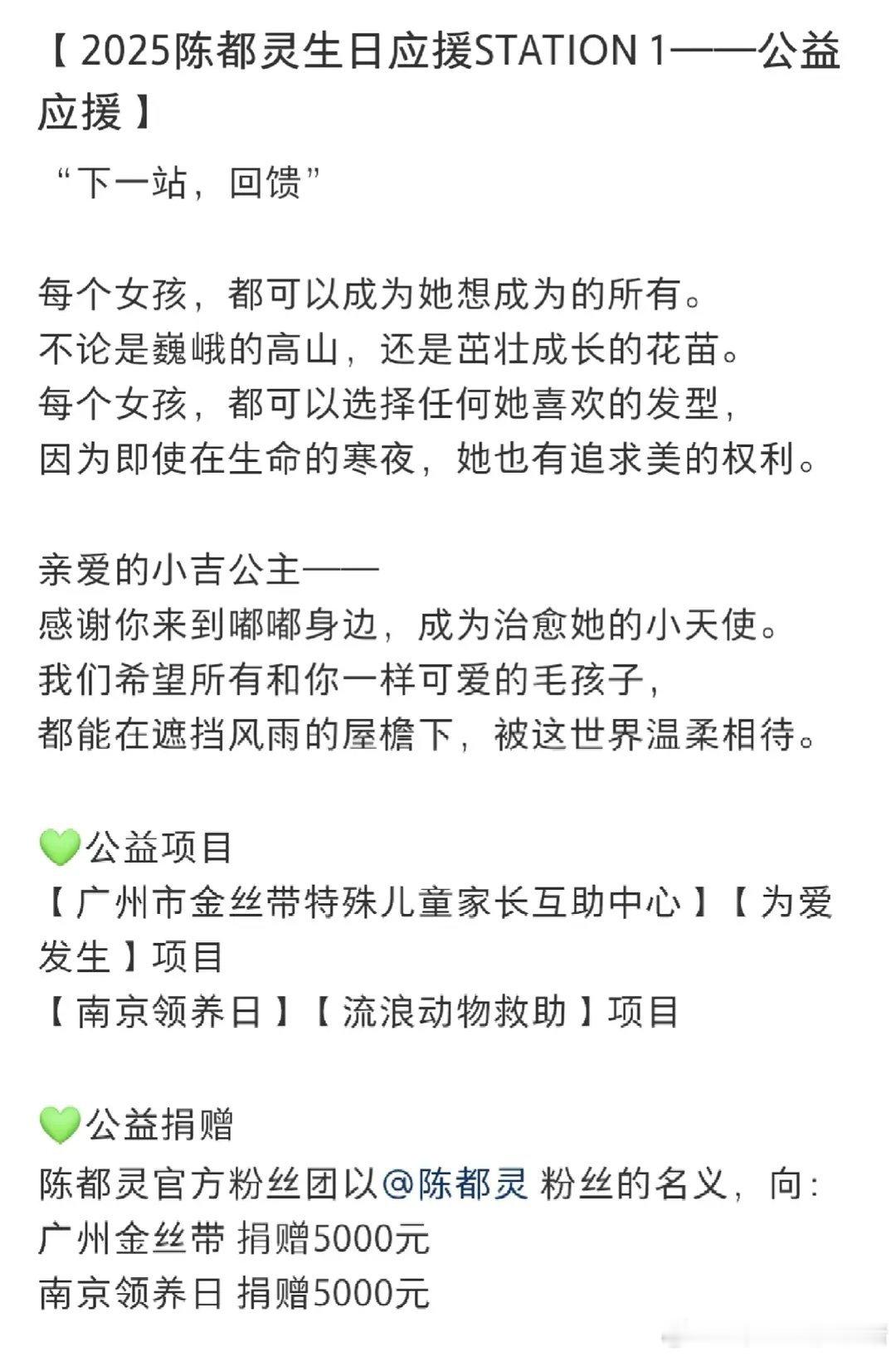 陈都灵生日之际,粉丝去资助流浪动物了,也在给特殊儿童群体做公益,陈都灵和粉丝真的好真诚,一直在默默做好事,如同朋友一般[抱一抱][抱一抱]