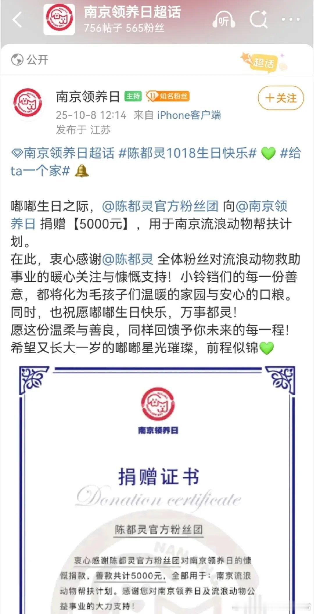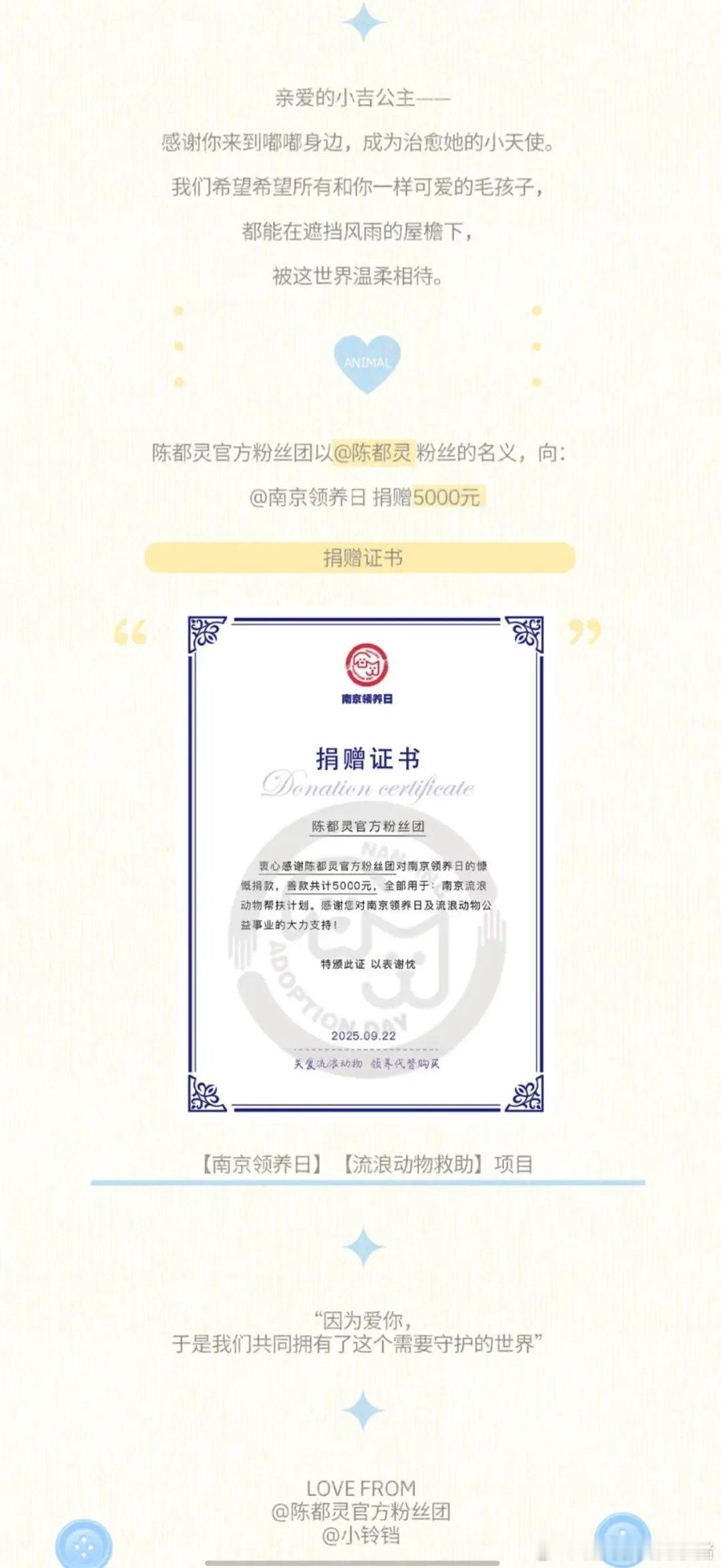 陈都灵生日之际,粉丝去资助流浪动物了,也在给特殊儿童群体做公益,陈都灵和粉丝真的