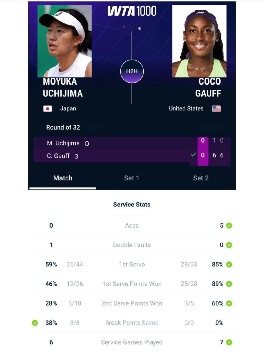 高芙6:1、6:0速扫内岛萌夏,轻松晋级到武网第三轮,全场耗时仅用了51分钟。球