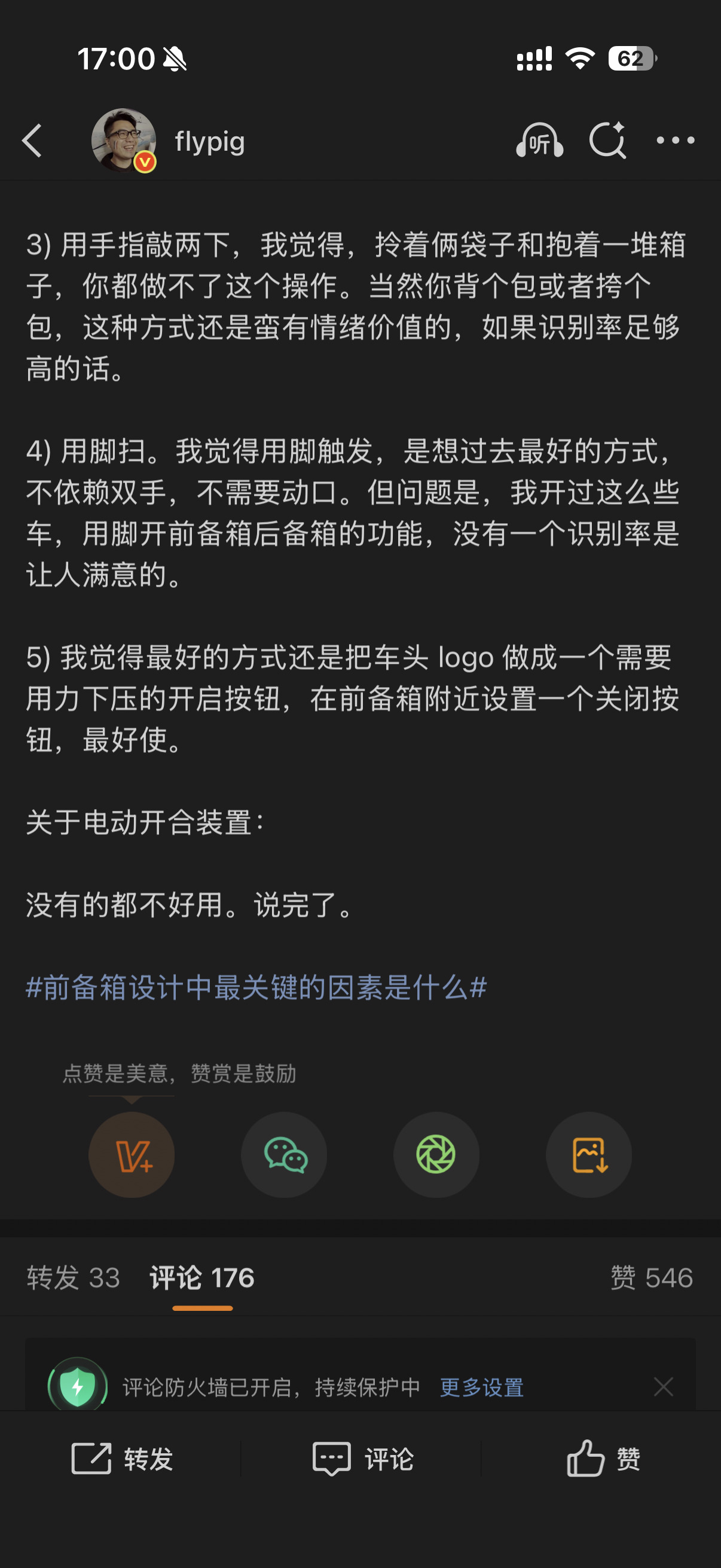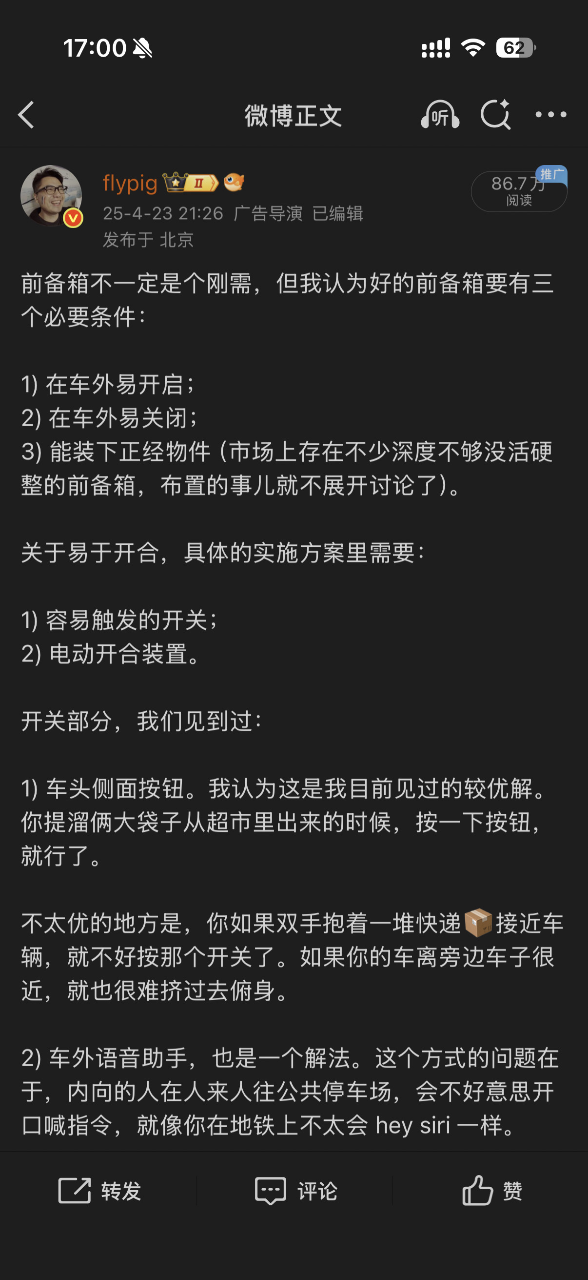 * 附图是我之前写过的微博,那时候我还不知道 ES8 前备箱是啥样子。 这里面写的所有交互方式,应该都支持。且是唯一支持车头 logo 按压的。
