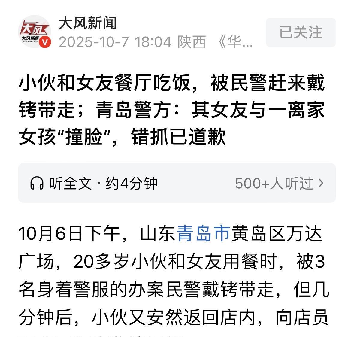 山东青岛,男子和女友正在餐厅吃饭,突然被3个民警在众目睽睽下戴铐带走了,男子懵了,他从没干过犯法的事,就问民警怎么了?民警说别问了,抓的就是你!没成想,只过了5、6分钟,男子又被民警送回来了,一问才知道,他们误把男子女友认成一个走失的女孩,以为男子是坏人,这才抓错了人,事后,民警向男子道了歉。 10月6号下午三点多,一对小情侣正坐在商场餐馆里吃饭。 20来岁的小伙子小王和女友小张有说有笑,谁也没想接下来会发生多么离谱的事。 就在这时,3个穿警服的民警突然冲进店里,直奔他们这桌而来。 当时店里还有其他顾客在吃饭,服务员和其他食客都看傻了眼。 小王自己也是一脸懵,但他还是礼貌询问道:你好,怎么了? 结果为首的民警来了一句“别说怎么了,抓的就是你!”,接着就掏出手铐把小王铐上了,并把人往店外拽。 女友小张当时就慌了神,她跟着民警追到电梯口,只见民警把小王推进电梯,说要带去问话。 男友被带走后,只剩小张在原地无措,急得眼泪都要掉出来。 没成想,就在她以为男友犯了什么事的时候,男友却在5、6分钟后又回来了,这让她更是一头雾水。 这究竟是咋回事呢?原来啊,民警在办理一起13岁女孩走失案时,把小张的照片误认为是那个离家出走的小姑娘。 他们打电话给小王让他配合调查,可小王以为是诈骗电话,直接给挂了,还把号码拉黑了。 民警一着急,就直接当面抓人了。 小王回到餐厅后,问店长能不能把刚刚事发时的监控传给他? 店长说可以,接着帮忙调出监控,视频里清清楚楚拍下民警从进门到抓人,再到放他回来的全过程。 小王看后直呼离谱,吃个饭还能被当成拐卖犯,真是没谁了! 店长也说,自己干餐饮这些年,头一回见警察冲进来拷人的。更让店员们心里发毛的是,警察全程没亮证件,进门就抓人。 事后记者找警方核实,民警说这事儿归东区管,具体细节不清楚,而且不一定是他们的人。 最后辗转联系到当事警察,对方承认是照片比对出错了,研判信息时出了岔子,把情侣照和走失女孩照片搞混了,这才闹出乌龙,他们当场就给小王解铐并道歉了,小王没再追究。 有人认为,在大庭广众之下随随便便将一个人铐走?怎么就一句抓错了完事呢?起码要公开道歉并赔偿精神损失费吧! 也有人说了,办案程序正常合理,给大家科普一下。第一,发现可能是嫌疑人的可以查询嫌疑人电话;第二,可以向嫌疑人打电话询问了解情况、打电话不一定是传唤。第三,照片再次向报案人确认,高度吻合,可以确认是嫌疑人,对嫌疑人可以采取上手铐;第四,穿着警服和执法记录仪可以不亮警官证,严格意义上还是要亮警官证。 宁可抓错,不可放过一个可疑人,询问很正常,除非暴力执法。 小伙虽然委屈,但还是为民警点赞,报案人说的肯定,警察当然按刑事拘捕,发现错误立马放人道歉可以了。 这件乌龙,警察责任不大,女孩爸妈都认错了,何况外人。还有照片里的民警身着制式服装,胸挂身份牌,再嫌疑人不配合情况下带离现场,在楼下识别后,道歉放回,很正常嘛! 那么,从法律角度,怎么看待这件事? 《人民警察法》第34条规定:人民警察依法执行职务,公民和组织应当给予支持和协助。非经法定程序,人民警察不得剥夺、限制公民的人身自由,不得搜查公民的身体、物品、住所或者场所。 民警在抓捕小伙时可能存在两处程序违法:一是未主动出示证件表明身份,违反“依法执行职务应亮明身份”的法定要求;二是直接使用手铐限制人身自由,却未当场说明具体事由及法律依据。 执法行为需同时满足“依法执行职务”和“法定程序”两个条件,而民警“不亮证、不解释、直接铐人”的行为,已构成对公民人身自由的非法限制。 即便后续证实是“照片比对错误”,但程序违法性仍独立存在,警方需要就执法程序瑕疵承担责任,包括对当事人的公开道歉及可能的国家赔偿。 《民法典》第1011条规定:侵害他人人身权益,造成严重精神损害的,被侵权人有权请求精神损害赔偿。 小伙在餐厅公共场合被当众铐走,虽仅持续数分钟,但“被误认为拐卖嫌疑人”的标签及“手铐加身”的视觉冲击,已对其名誉权、人格尊严造成实质损害。 结合《民法典》第1183条对“严重精神损害”的认定标准,本案中公众围观、女友受惊等情节,已构成“社会评价降低+心理创伤”的双重损害后果。 小伙可据此要求警方承担赔礼道歉、消除影响等民事责任,如果经鉴定存在持续心理创伤,比如产生应激障碍,还可主张精神损害赔偿。 对此,你怎么看? 关注@运良说法 学法律知识不迷路 #头号创作者激励计划#