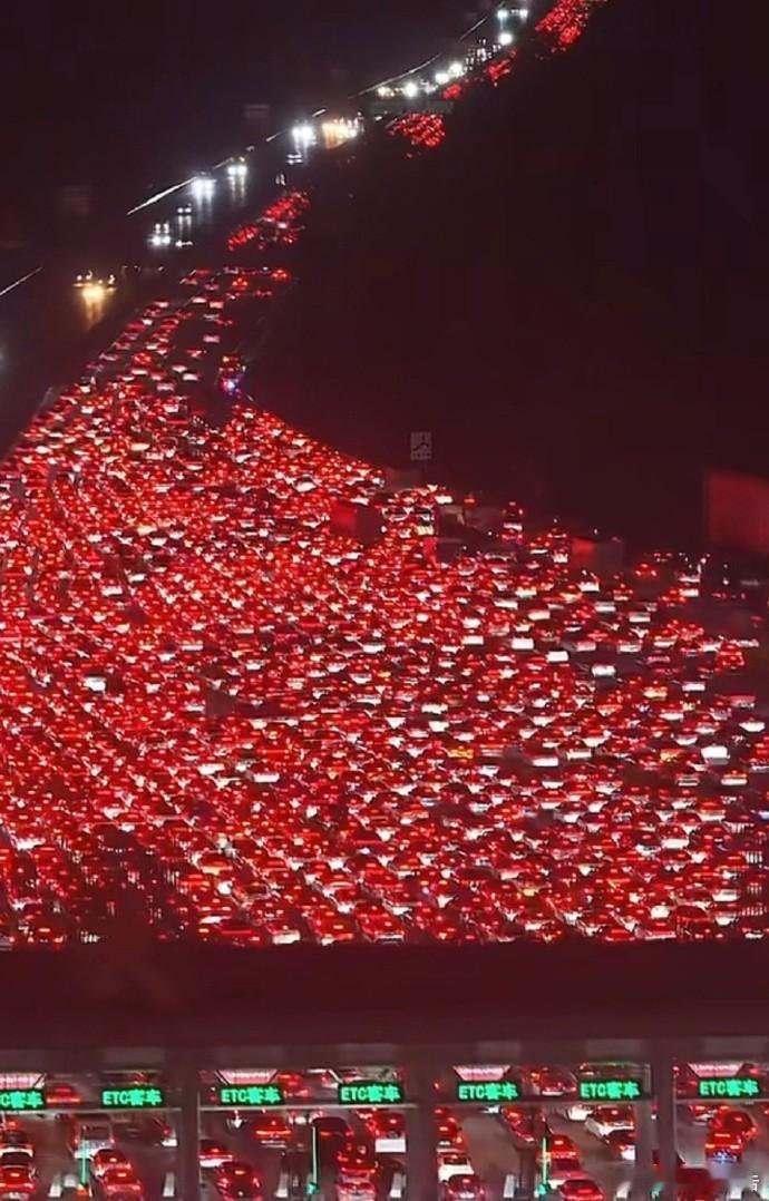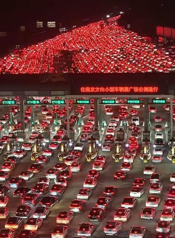 10月7日,中国最大的安徽吴庄收费站迎来返程高峰,双向36道闸口全开仍被车流 “填满”。夜幕下,车灯连缀成 “流动星河”,绵延数公里。景象震撼全网。