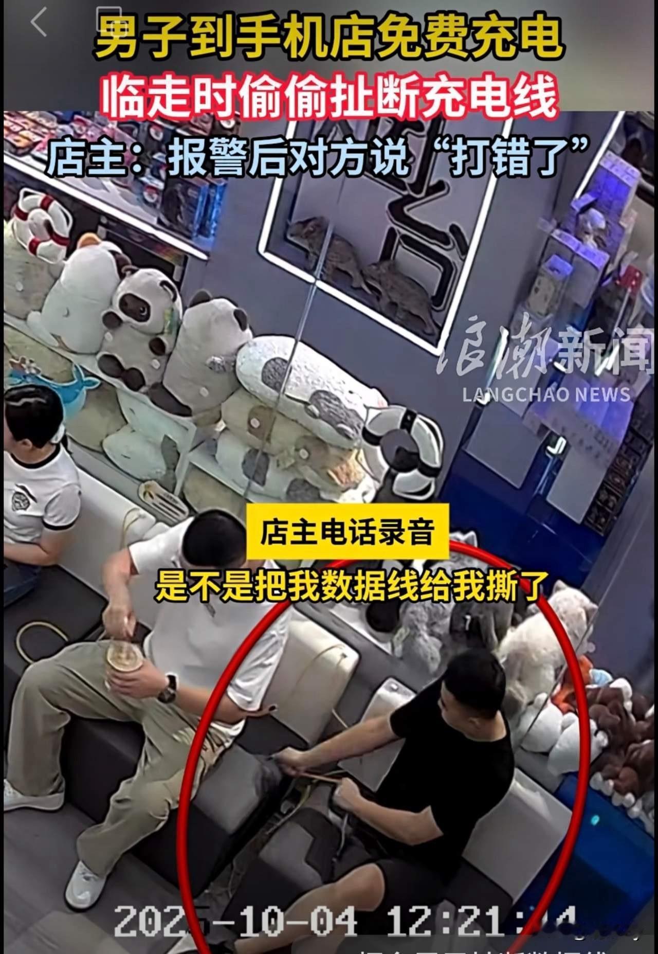 关于烟台男子撕坏充电线事件,男子否认自己干的并拒绝道歉! 10月4日,两男两女四个人坐在一商店的免费休息区内给手机免费充电,大概充了半个小时左右,一名黑衣男子把两根数据线从椅子缝中拽出来使劲地给扯断后,放在椅子上就离开了! 店老板说中间没有和四人发生过任何矛盾,四人坐在沙发上还有说有笑的,不明白为什么走的时候会把充电线扯断! 店主根据车牌号查到此人,就打电话联系黑衣服男子,可是男子在电话里并不承认自己扯断了线,没说两句话匆匆就挂断了电话,而且已经离开了烟台! 店主报警后,因为数额太小无法立案,店主的诉求就是希望黑衣男子道歉!进店不打招呼也就算了,为什么还要干这种损人不利己的事! 黑衣男子这样的行为适合曝光出来,让大家都认识他!老板设立这样的区域就是为了方便大家,别让部分无德之人寒了善良人的心!