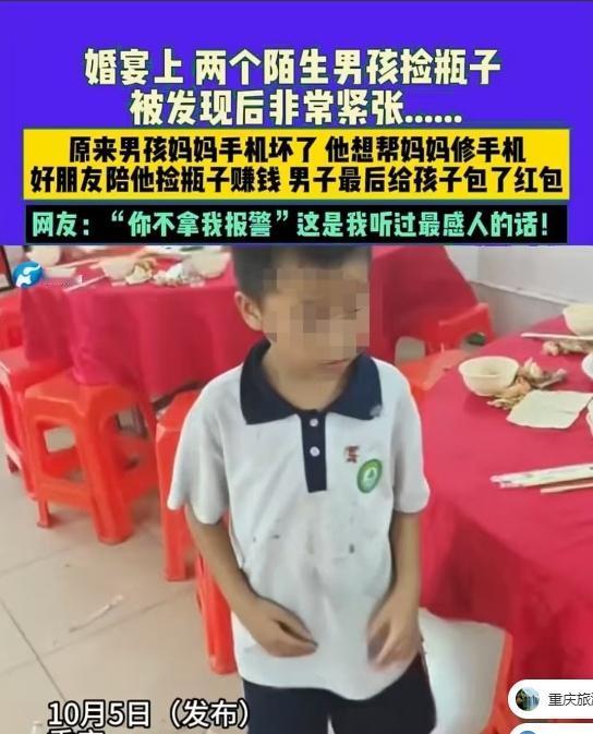 “被感动了!”重庆,一家人正在办婚宴,两个陌生男孩进来捡瓶子,被发现后很紧张,追问后得知想赚钱帮妈妈修手机,男子得知后一人包一个红包,俩孩子激动的拒绝,结果男子“霸气”地说必须接住,要不然就报警,还加了一句,一人喊他一声帅哥,   婚宴现场热闹非凡气氛喜庆,两个十岁左右的小男孩却显得格格不入,他们悄悄溜进现场东张西望,目光始终盯着桌边的空瓶子,这一异常举动很快引起了一位男子的注意。   他走上前去询问,孩子们起初有些紧张,支支吾吾地说只是“随便看看”,在男子的耐心追问下,穿白衣服的小男孩终于道出了实情。   他们想捡瓶子卖钱,因为他的妈妈手机屏幕坏了没钱修理,而旁边的戴眼镜男孩是他的同学,特意陪他一起来帮忙。   听到这里男子心中一震,他意识到,这两个孩子并非出于贪玩,而是想用自己的方式为家庭分忧,他告诉孩子们,那些瓶子是婚宴现场的,不能带走。   但看着孩子们失落的眼神,男子动了恻隐之心,他从口袋里掏出两个红包,分别递给他们,两个孩子连连摆手,表示不能接受,男子却“霸气”地笑着说:“必须接住,不然我就报警了!”   他还调皮地加了一句:“你们得一人喊我一声帅哥,”孩子们被这番话逗乐了,最终接过红包,小声地喊了一声“帅哥”,脸上露出了久违的笑容。   这一幕被现场的宾客拍下并上传到网络,迅速引发了热议,一位网友评论道:“这两个孩子太懂事了,小小年纪就知道体谅妈妈的辛苦,而那位男子的行为更是温暖人心,他用一种幽默的方式保护了孩子的自尊心”。   另一位网友则感慨道:“现在的社会太需要这样的正能量了,男子的做法不仅帮助了孩子,也让我们看到了人与人之间的温情”。   从这件事中,我们看到了孩子们纯真的孝心,也感受到了陌生人之间的善意,那个穿白衣服的小男孩,为了帮妈妈修手机,宁愿在陌生的婚宴上捡瓶子,这种孝心令人动容。   而他的同学,没有因为家境的差异而疏远他,反而愿意陪他一起努力,这份友情同样珍贵,男子的善举更是让人感动,他没有直接施舍,而是用一种幽默的方式让孩子们接受帮助,既保护了他们的自尊心,又传递了温暖。   这件事也让我们反思,在现代社会中,我们是否还能保持这样的善意和温情?很多时候,人们因为忙碌而忽略了身边的细节,也因为戒备心而对他人的求助视而不见。   但这件事告诉我们,只要用心去感受,就能发现身边的美好,男子的行为不仅帮助了两个孩子,也感染了在场的每一个人,更通过网络传递给了更多的人。   最终这两个孩子拿着红包离开了婚宴现场,他们的脸上洋溢着笑容,而那位男子,也因为自己的善举收获了无数人的点赞,这件事虽然已经过去,但它带来的感动和思考却久久不能散去,希望这样的正能量能够传递下去,让更多的人感受到社会的温暖,也让更多的孩子能够在关爱中成长。   对于男子的做法,大家有什么看法?    素材:河南民生频道2025-10-6 --------------------------------