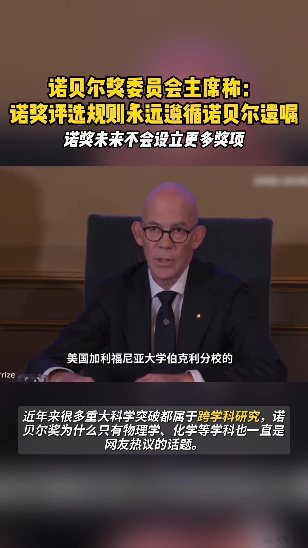 诺奖评选规则永远遵循诺贝尔遗嘱诺奖未来不会设立更多奖项 诺奖评委会主席重申将严格遵循诺贝尔遗嘱,不增设奖项。同时表示学科边界处最有趣,不排斥跨学科研究获奖,彰显诺奖既坚守传统又拥抱科学融合的开放态度。