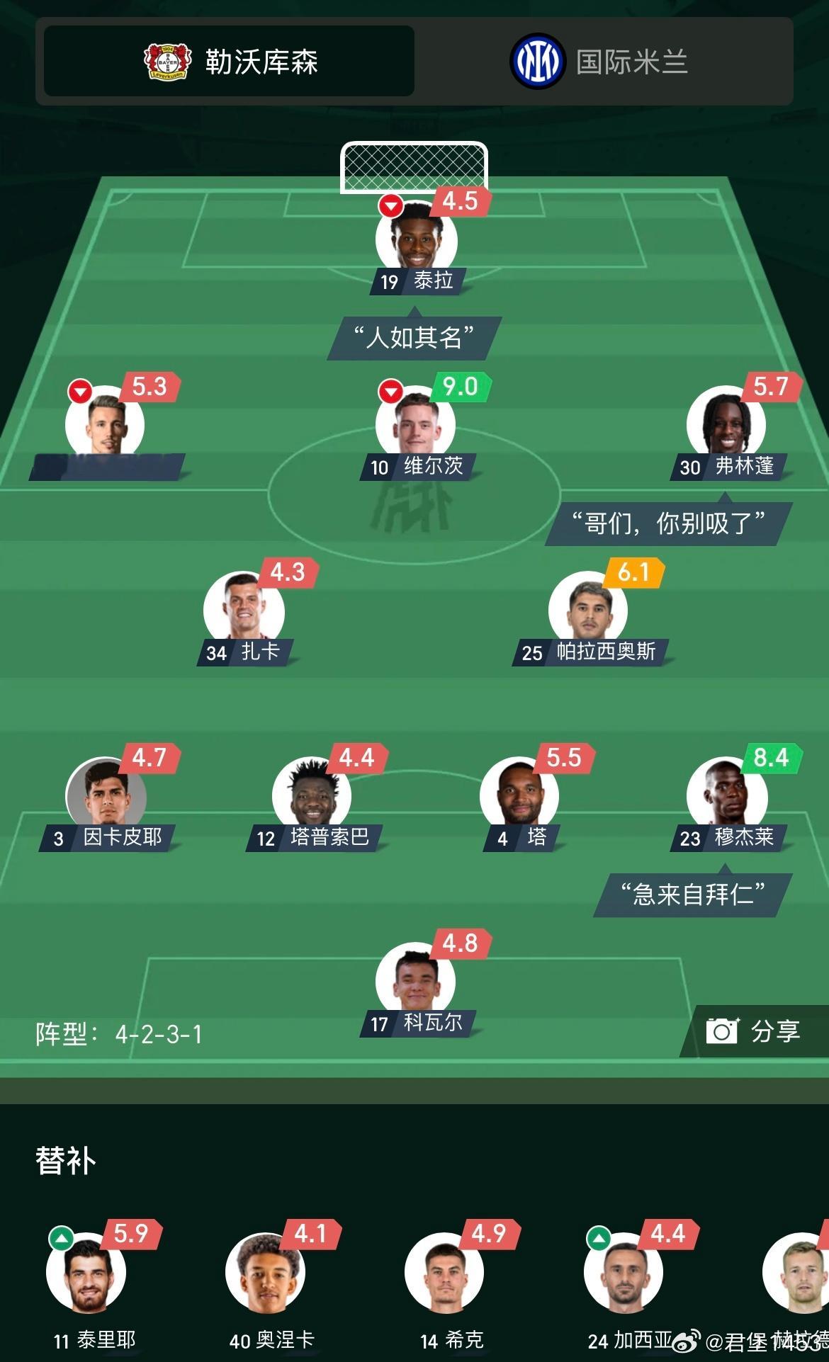 发现一个很有意思的规律。上赛季勒沃库森踢强队的赛后虎扑评分里,无论输赢,几乎是清一色的万花丛中一片绿。