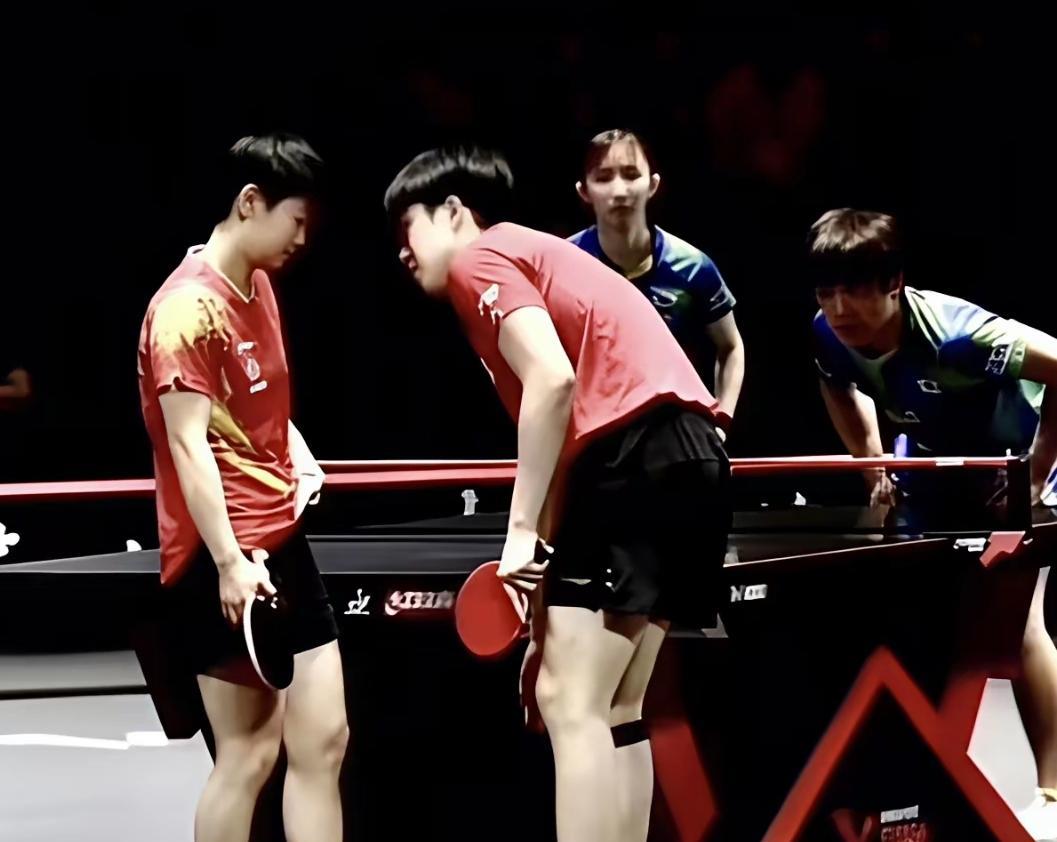 俩宝在嘀咕技能战术,感觉莎莎的打法可能让大头不适应,大头像个老师,莎宝像个做错题的孩子,往常都是莎宝像个老师在指导大头,哈哈,看来,大头提升后,莎宝再想当老师不容易。看见对面那双眼睛了吗?感觉他在憋足劲想听个仔细,高度集中,高度紧张,他一定听得懂才如此这般吧?早田希娜就很放松,因为她即使站在面前也不知人家在说啥。