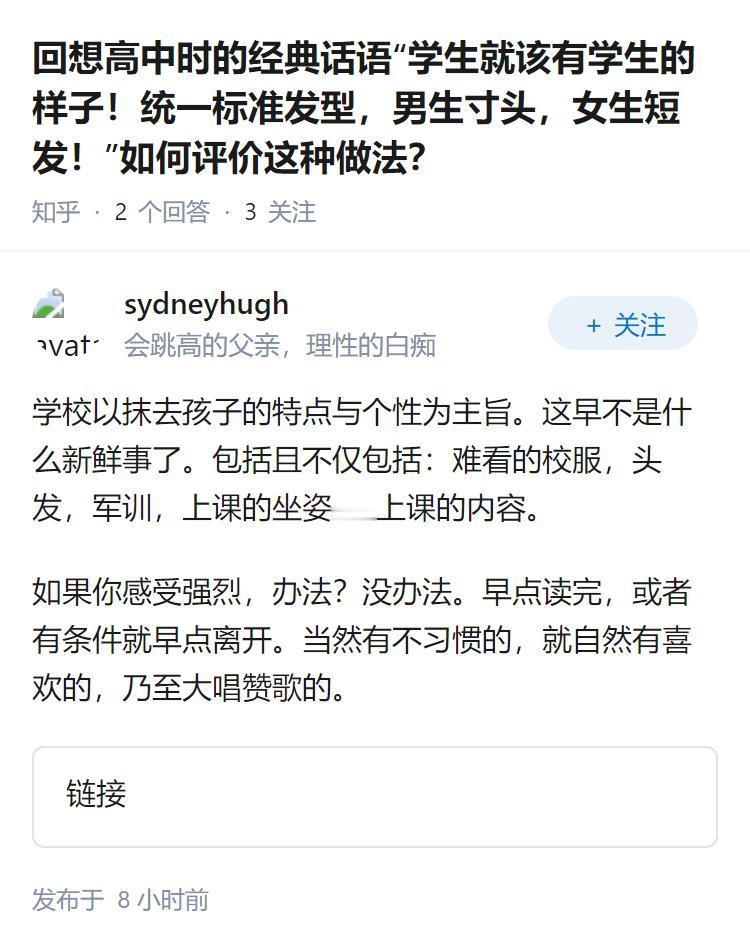 回想高中时的经典话语“学生就该有学生的样子!统一标准发型,男生寸头,女生短发!”如何评价这种做法?