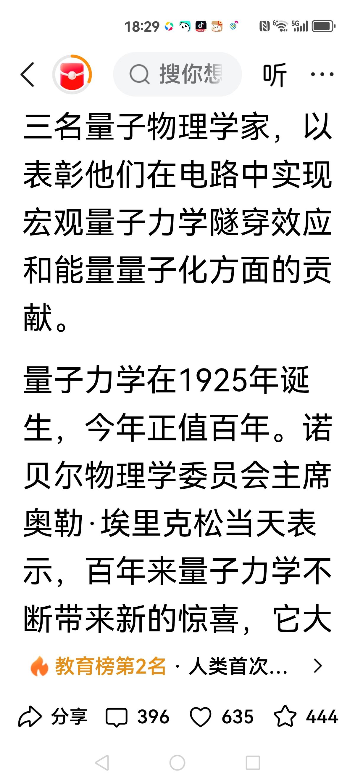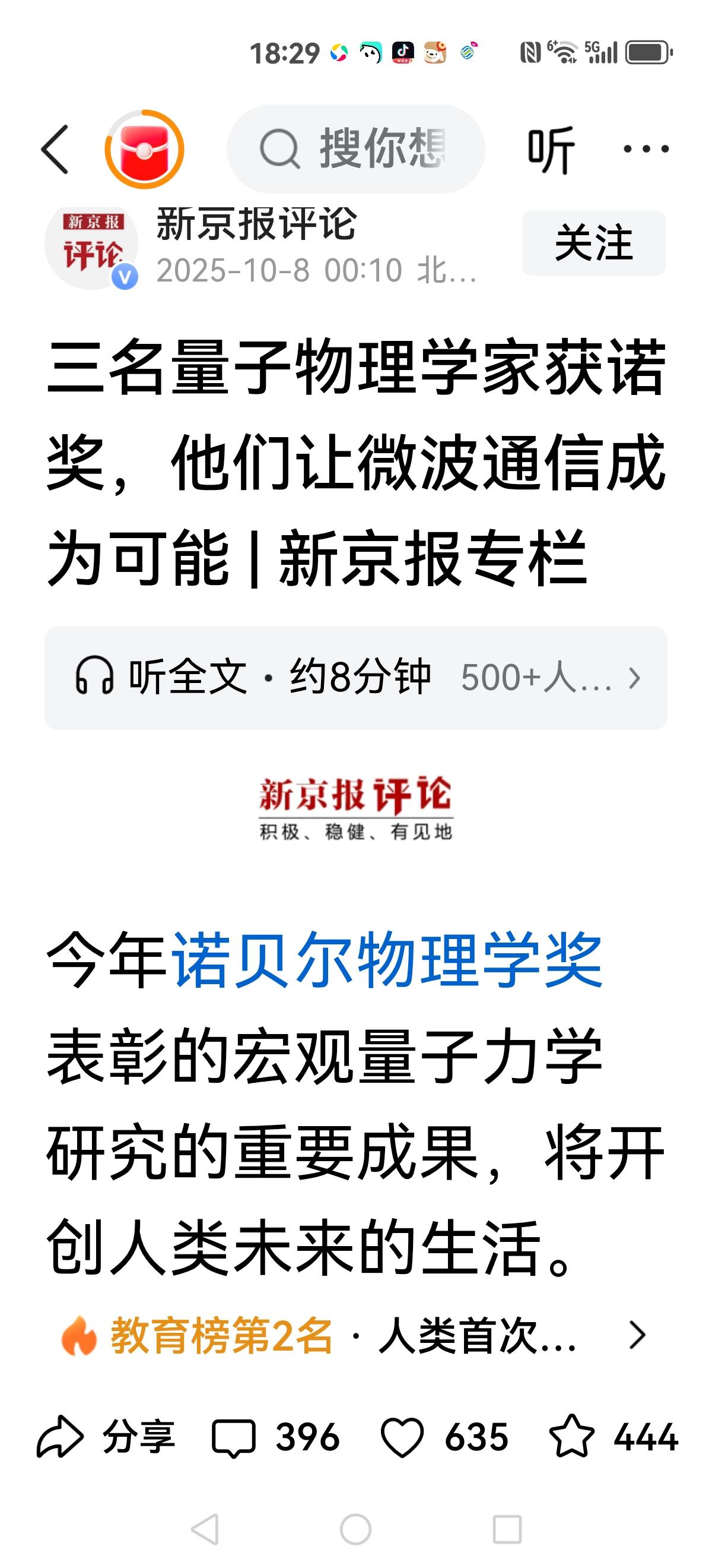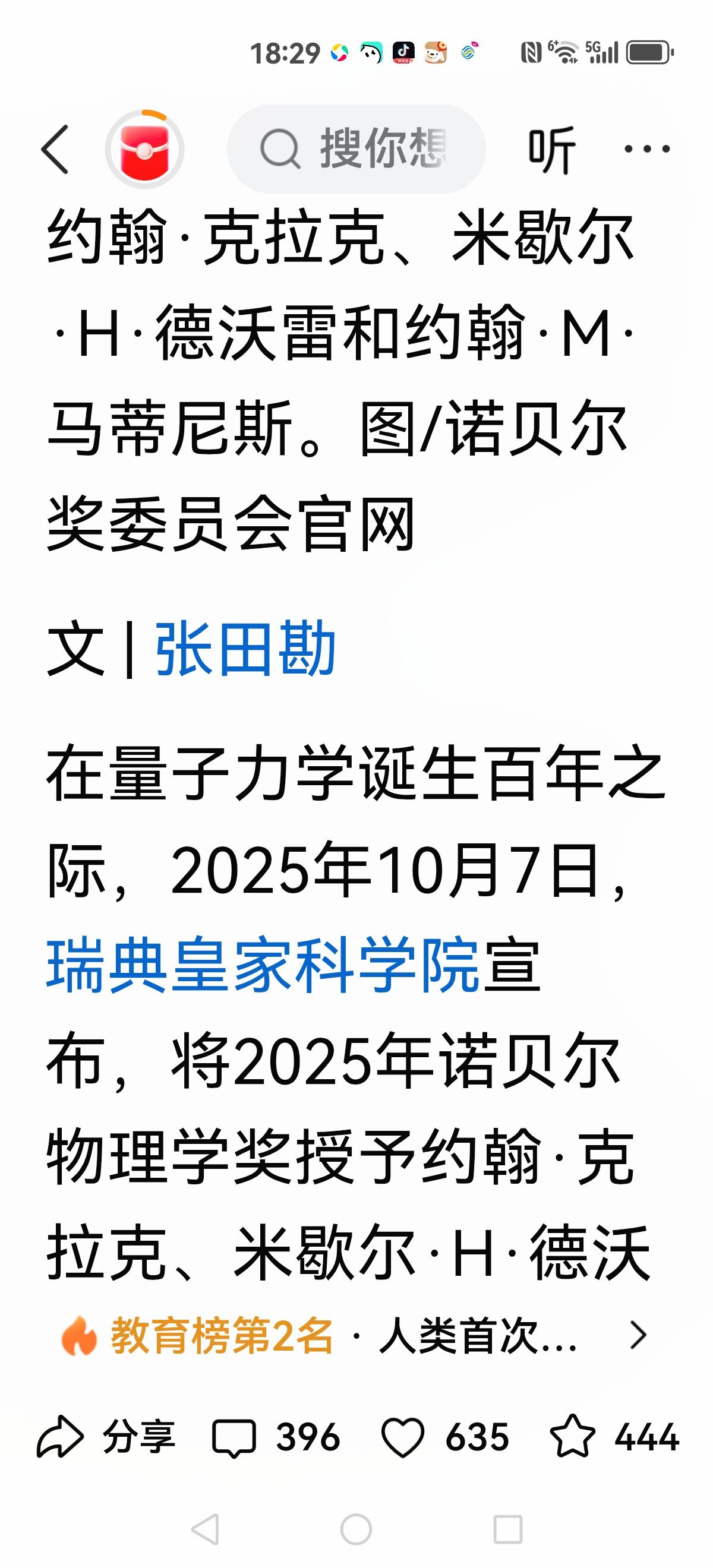 【我们的自信来自于这里?】 三位物理学家获得诺贝尔奖,而有些网友留言: 目前能发射量子卫星的只有中国,已有墨子号,济南一号在空中。能制造量子计算机的有中美加三国,中国本源悟空量子计算机已开始试商用。 因为这是带政治色彩的外国奖(瑞典评委,瑞典规则),获不获奖都不影响中国科学家在量子科学方面的前进步伐! 这一看就是带有普遍性的观点,也就是我们都有,只是诺贝尔不给我们颁奖?这也是自信带来的自豪感。 但是,我们所拥有的量子卫星的理论基础是哪里来的?是不是人家的成果?如果一味这种心态,那还能前进吗?