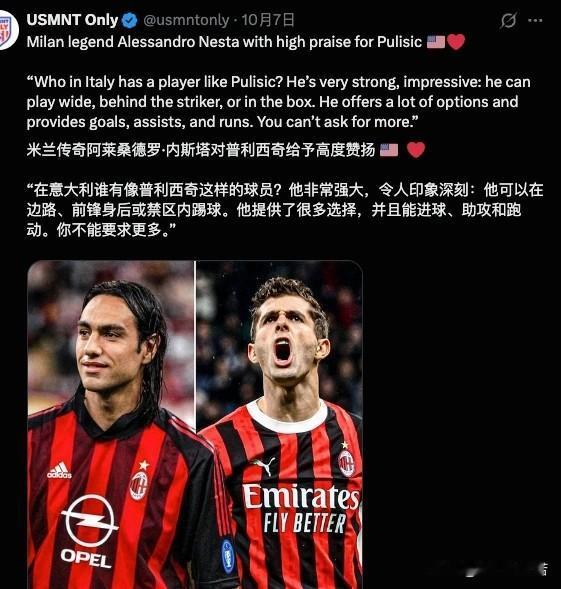 普利西奇!内斯塔接受采访表示普利西奇是米兰锋线上的巨星,他拥有在多个位置上的进攻能力,普利西奇可以在不同位置完成助攻与进球。他的跑动能力同样十分出色,我们已经不能对这样的球员有太多的要求。 记得普利西奇加盟米兰的时候,大家一开始担心普利西奇的伤病,一个月后丘库埃泽来了又觉得普利西奇可能右路不一定能与丘库埃泽竞争,结果普利西奇在最不擅长的右路两个赛季数据仍然优秀,这个赛季变了阵容又有人说莱奥有一个首发位置,普利西奇可能要接受替补了,结果普利西奇依然是米兰的大腿,啥是球星,就是在任何情况下都能有不俗的表现。 内少本次接受采访之所以提普利西奇,明显这是在给普利西奇减压,什么是好前辈?这就是好前辈,世人皆能借风扬尘,顺势踩落井之人,难得的是逆风执炬,为寒冬送炭之手!内斯塔一直都表达自己是拉齐奥球迷,但他一直心里都有米兰,一直都在关注着米兰的情况。