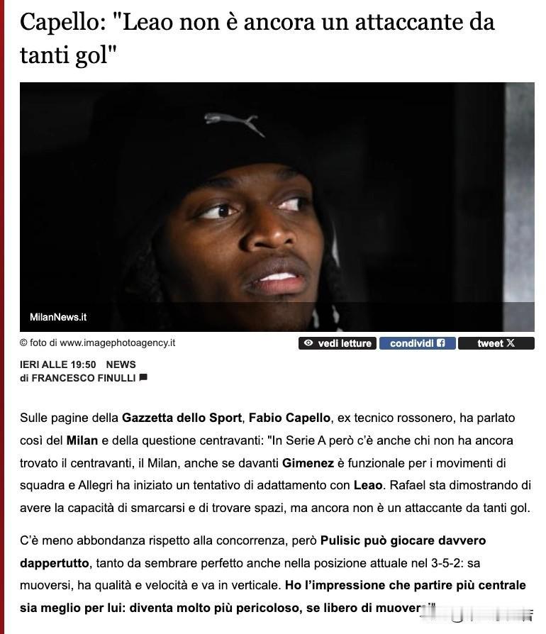 米兰中锋问题!米兰名宿卡佩罗谈米兰中锋问题,法比奥·卡佩罗说意大利联赛很多球队都缺乏优秀的中锋球员,米兰只是其中一员,米兰到现在确实没有找到合适的中锋。 我认为希门尼斯是一名优秀的球员,希门尼斯在前场的跑动对球队战术很有帮助,但希门尼斯并不是一名中锋球员,他更像一名二前锋球员,所以阿莱格里把莱奥作为中锋人选。 阿莱格里尝试让莱奥适应这个位置,莱奥正在展现出摆脱防守和寻找空间的能力,但他仍然不是一个能进很多球的前锋。我看到了阿莱格里的发言,他对于莱奥的要求并无不妥?作为中锋完成进球确实是锋线球员的工作,但莱奥或者希门尼斯并不能完成中锋球员的工作,他们无法胜任这个位置。卡佩罗认为可以尝试把普利西奇安排到中锋位置,尝试无锋阵打法。 卡佩罗同时谈到了米兰锋线现在状态火爆的普利西奇,卡佩罗认为普利西奇是一名非常全面的球员,他懂得如何跑动,具备技术和速度,并且能纵向推进。我觉得让他从更中路的位置出发对他更有利,如果能自由移动,普利西奇在中锋位置会比其他人更加危险。