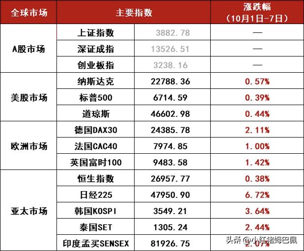 国庆假期全球主要股市涨跌幅,可以看到大部分市场都是收涨的,这给明天A股开盘带来了