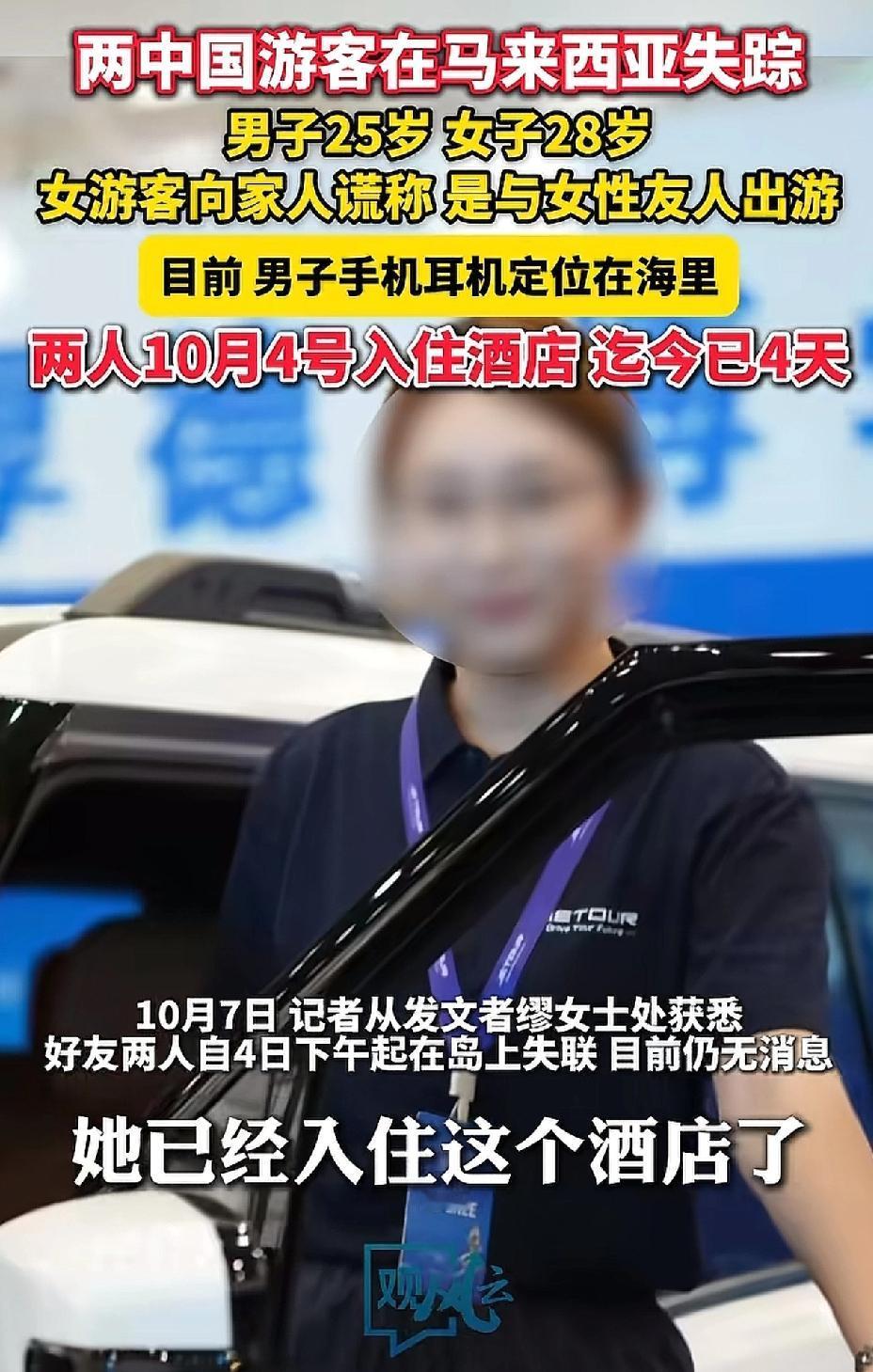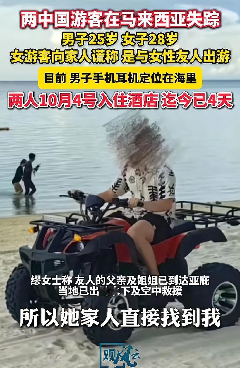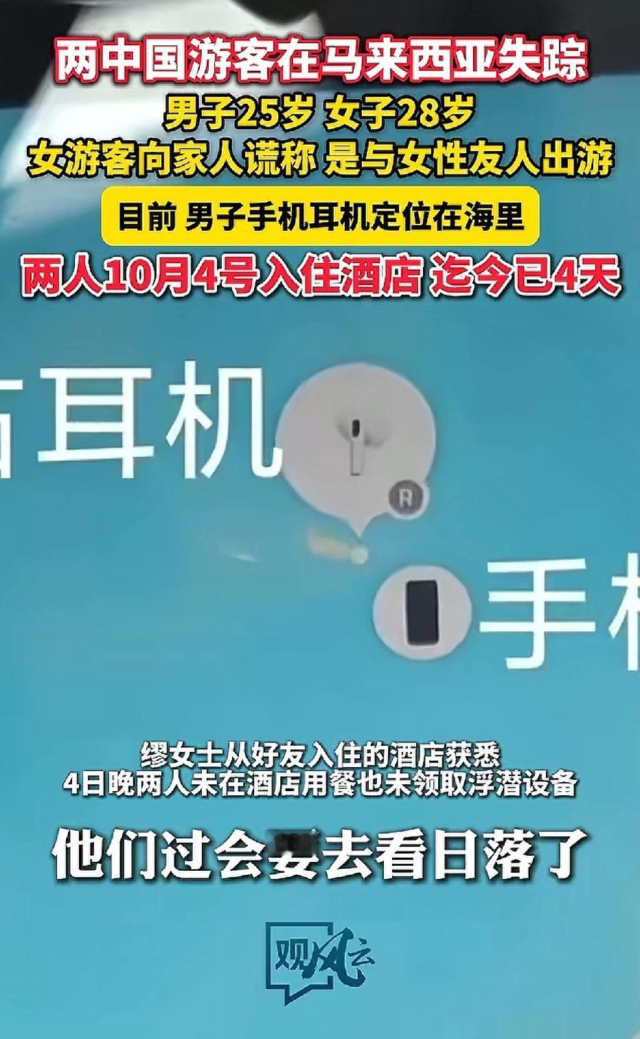 28岁的中国女子向家人谎称和闺蜜去马来西亚旅游,实际上是和一位25岁的中国男子前往马来西亚游玩。 10月4日,女子在家庭群告知家人已入住当地美人鱼度假村。 男子的最后消息,是即将出海看日落。 10月5日度假村见两人没按约定退房,立马报警。 10月6日,女子家人始终未得到她的消息,向其闺蜜打听后才发现她并非和闺蜜一同出游。 截至目前,两人依旧音信全无,男子一只耳机定位显示在海里。另一只耳机定位在当地的市中心。 经查询酒店记录,4号当天两人未在酒店用餐,也未领取游泳用的浮漂,不过有网友看到,他们当天穿着泳衣下海了。 大概率当天就出事了。 双方家人均已奔赴马来西亚,女方家属先抵达,已开始在海里展开打捞工作。 这两人究竟去了哪里?是遭遇意外了吗?为什么要瞒着家人出行呢? 而闺蜜把两个人出行失踪的事,曝光在网络上,是想让中国在马来西亚的游客,帮助提供信息吗? 我一直觉得,祖国山河秀丽、风光旖旎,怎么看都看不够,从未有过去国外旅游的想法。 来源:美丽浙江