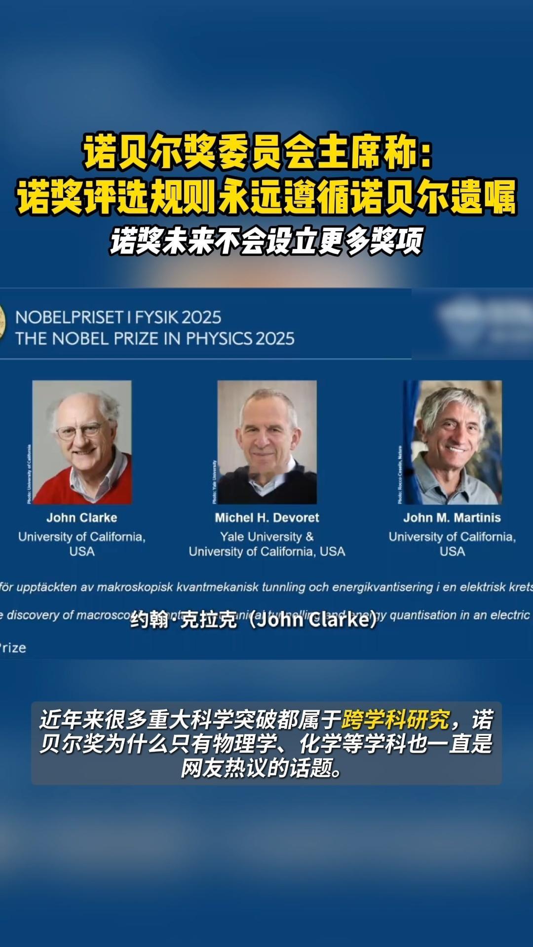诺奖评选规则永远遵循诺贝尔遗嘱 2025诺奖物理奖聚焦宏观量子隧穿,关于跨学科与奖项增设的热议,评委会主席以诺奖初心作答:始终遵循诺贝尔遗嘱,不新增奖项,却以开放姿态拥抱边界科学——毕竟最动人的突破,本就该在学科的交汇处发光。诺奖未来不会设立更多奖项