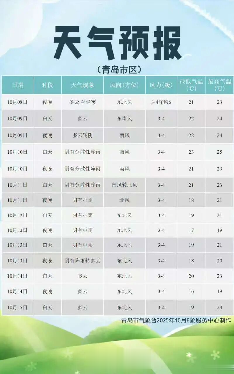 [青岛市区]今天夜间,多云,有轻雾,东北风3到4级阵风6级,明天白天,多云,东南风3到4级,相对湿度60%—85%,明天最低气温21℃,最高气温24℃。