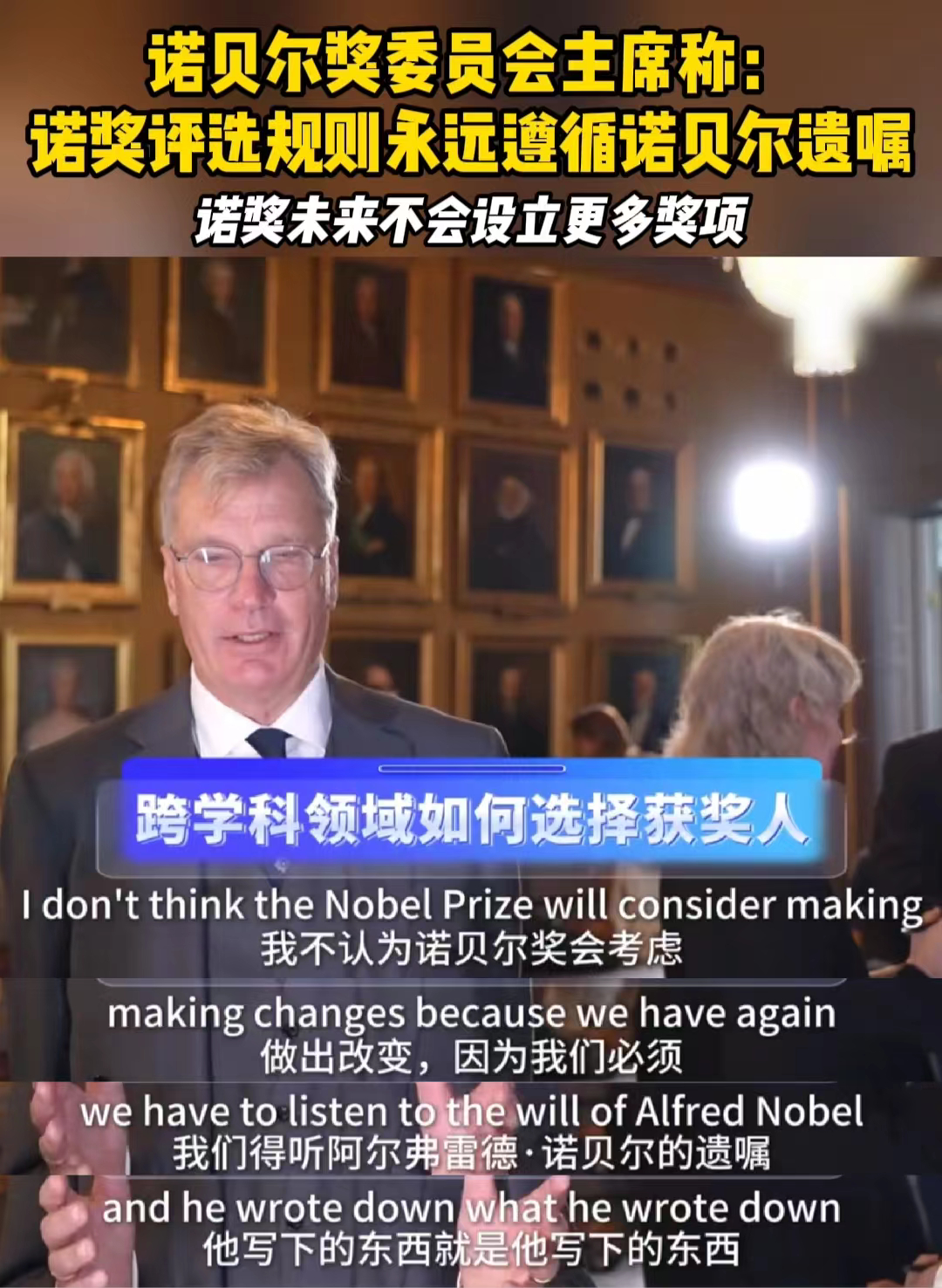 诺奖评选规则永远遵循诺贝尔遗嘱1896年,阿尔弗雷德·诺贝尔逝世后留下了3100万瑞典克朗的遗产,这笔钱被指定用于设立一项奖励人类杰出贡献的基金。根据诺贝尔的遗嘱,该基金共设立五个奖项,包括:物理学奖、化学奖、和平奖、生理学或医学奖、文学奖。后来瑞典中央银行又设立了诺贝尔经济学奖。诺奖未来不会设立更多奖项