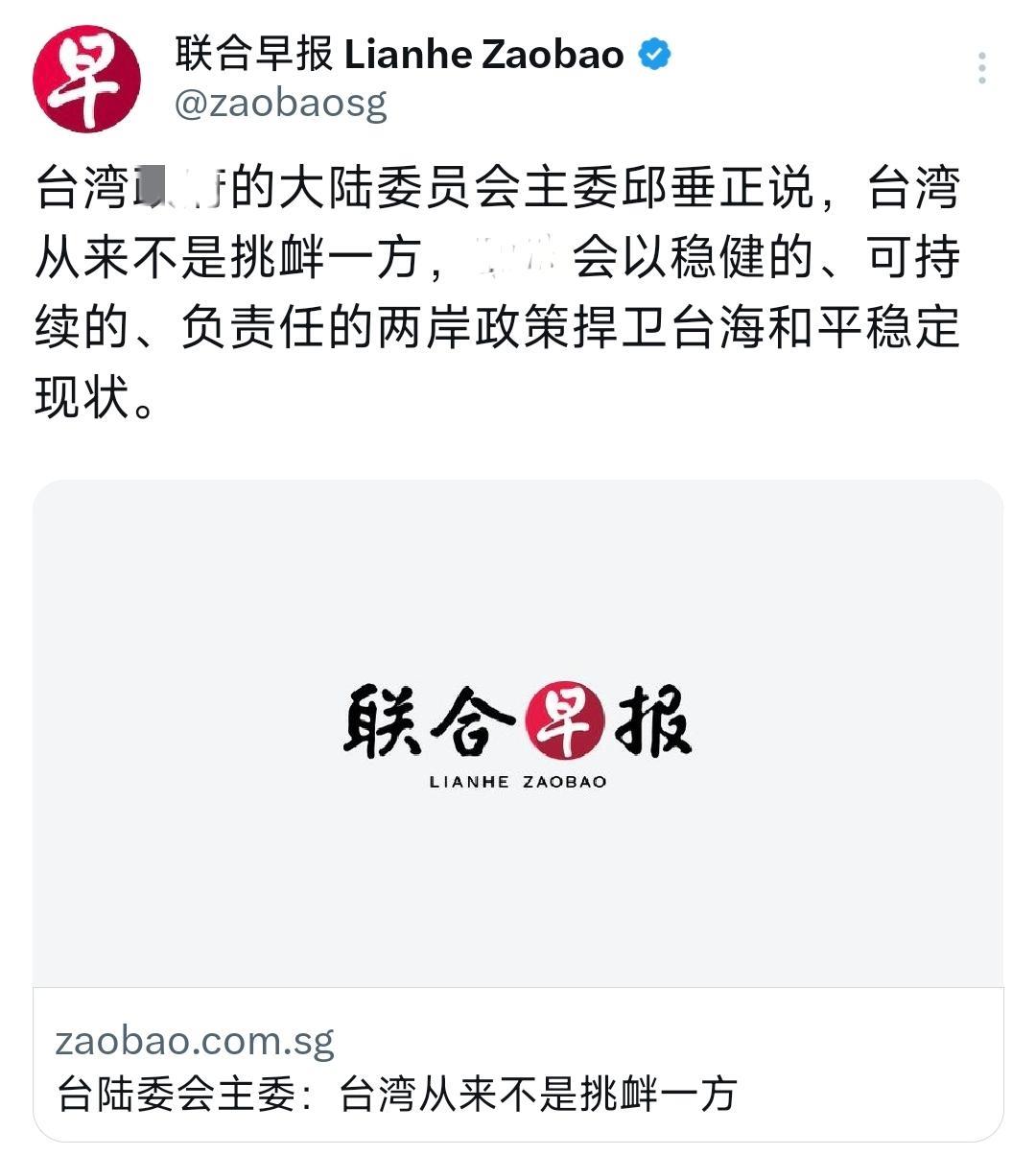 外媒今天(10月8日)报道:“台湾大陆委员会主委邱垂正说,台湾从来不是挑衅一方,台当局会以稳健的、可持续的、负责任的两岸政策捍卫台海和平稳定现状。” [机智]评几句:民进党当局这种“台独”与“保和平”的荒诞双标,堪称政治诈骗的巅峰表演。一边高喊“两岸互不隶属”推进“台独”,一边又妄图用“和平”话术粉饰分裂行径,实则是将台湾绑上“台独”战车推向黑暗深渊。民进党当局所谓“稳健政策”,不过是向美日主子递上的投名状。历史早已证明:分裂者必遭唾弃,“台独”之路终是死路!