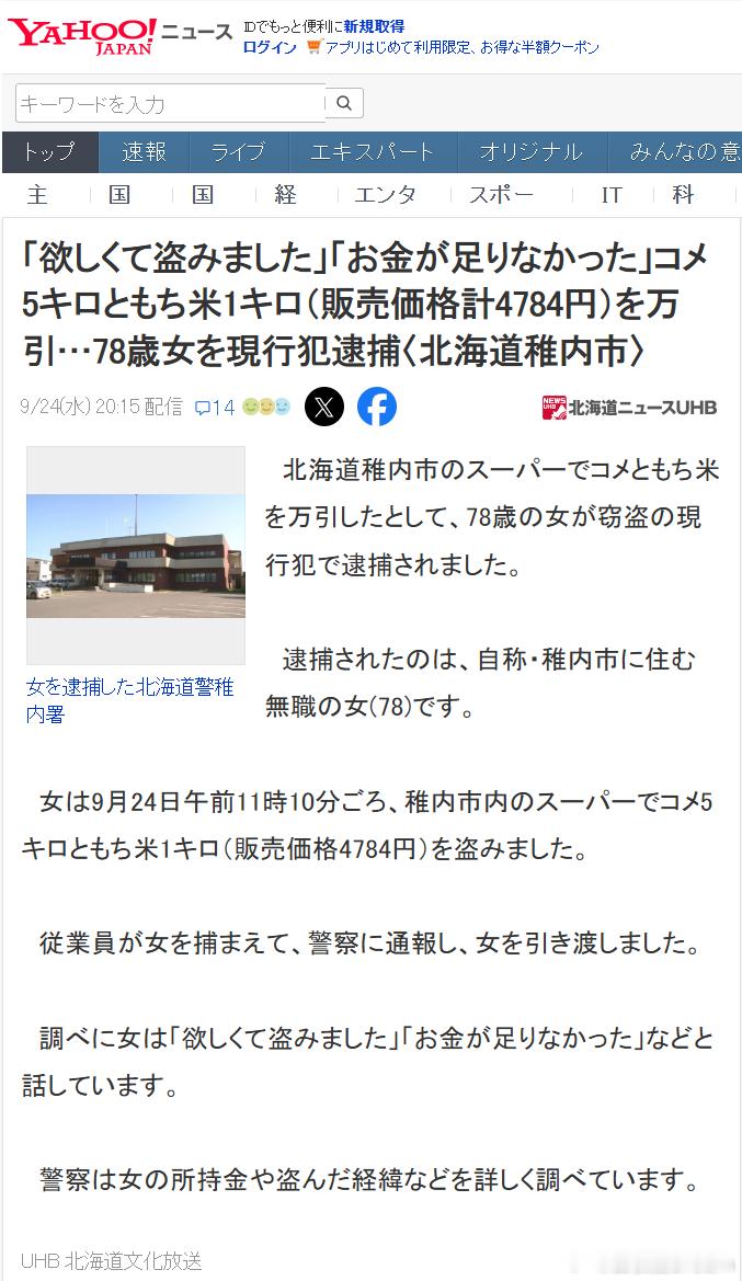 🔻一名78岁的日本妇女因为在北海道稚内市的一家超市里偷窃大米和糯米而被当场逮捕。