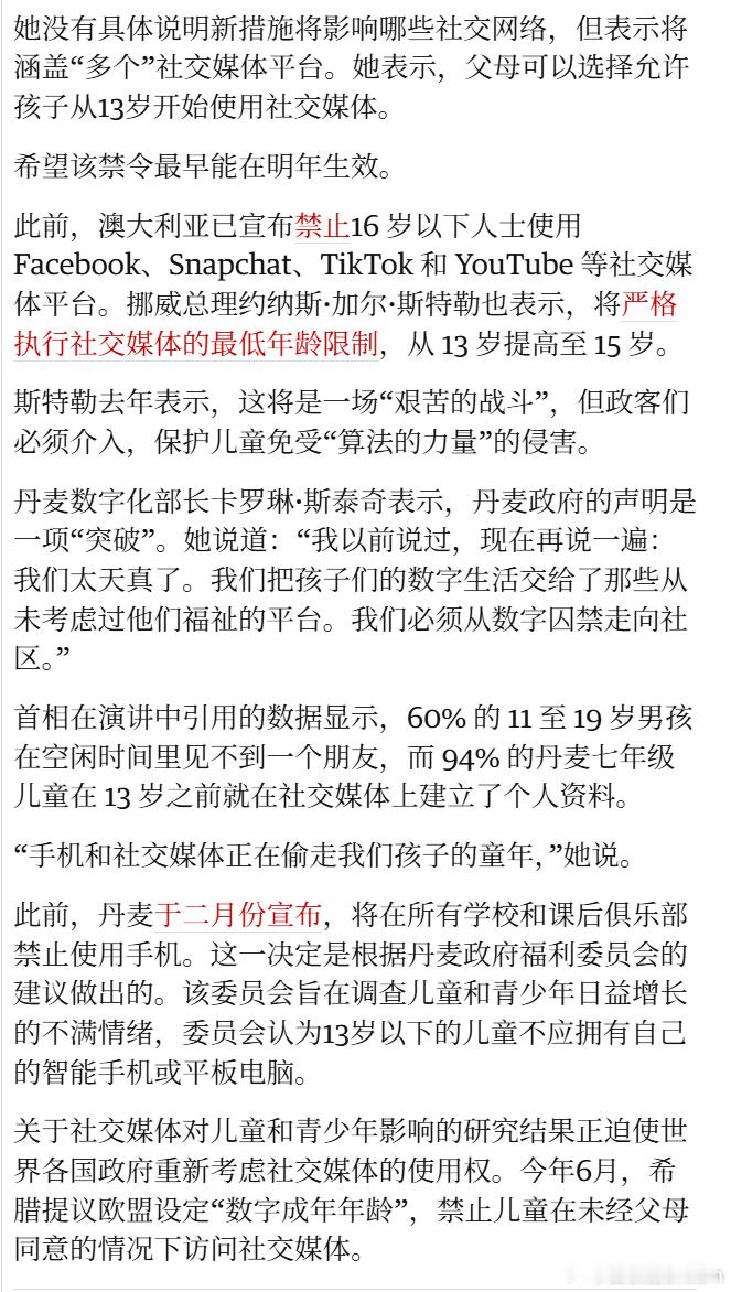 🔻丹麦计划禁止15岁以下儿童使用社交媒体。