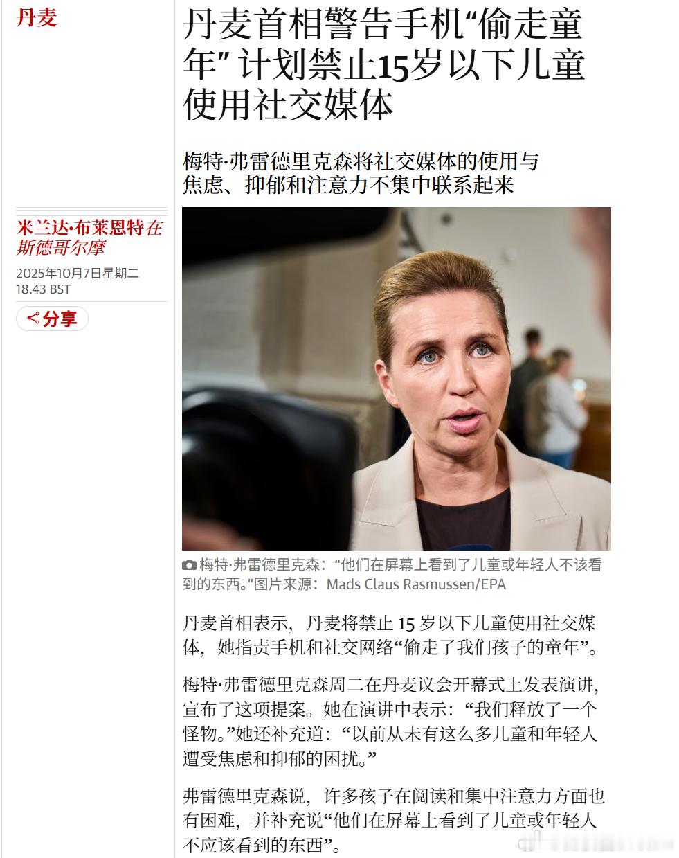🔻丹麦女首相指责手机偷走了孩子的童年,导致了儿童和年轻人患上焦虑症和抑郁症。未成年人在屏幕上看到儿童不应该看到的东西。