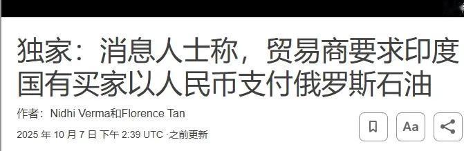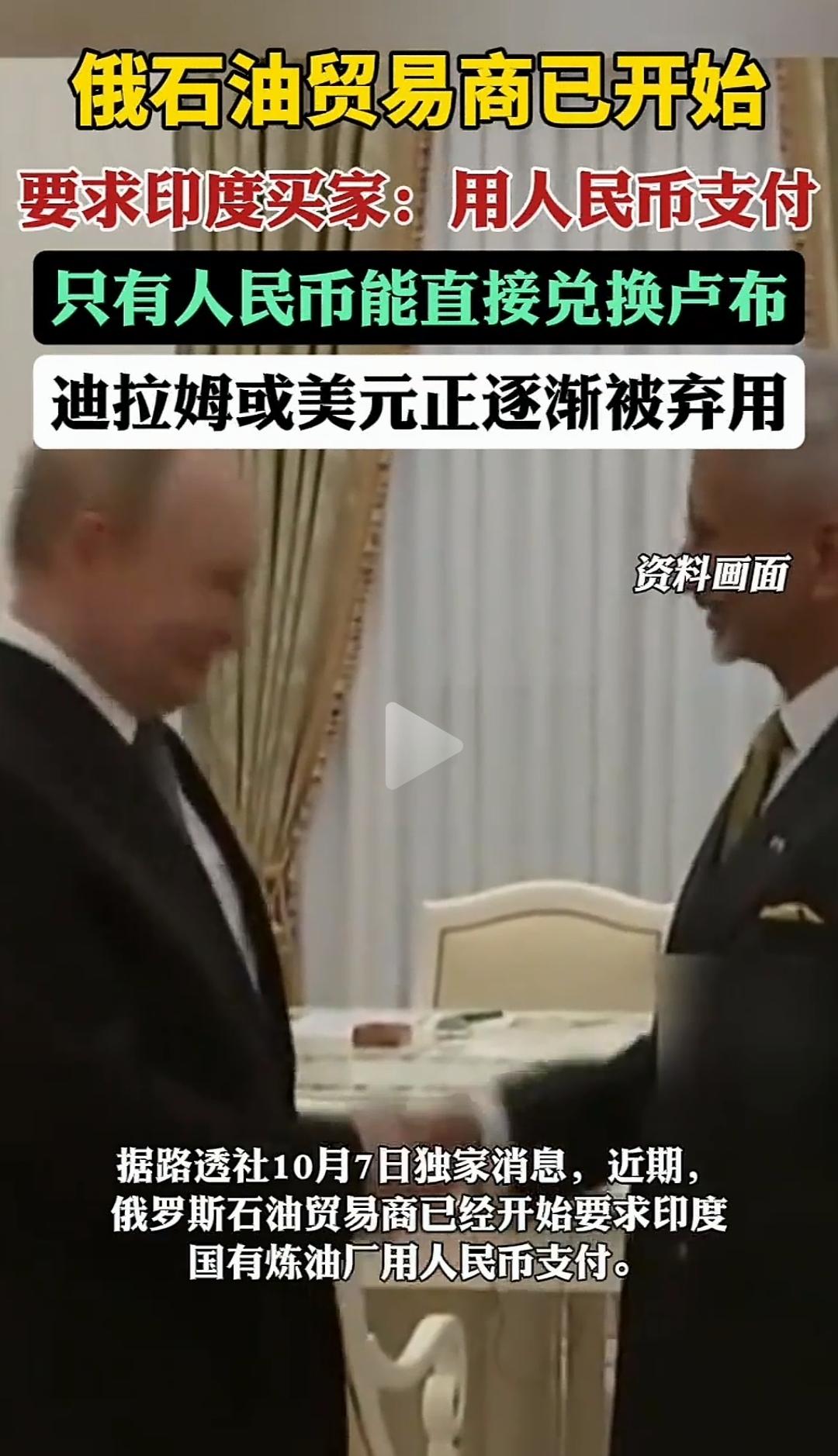俄罗斯贸易商对印度提出要求,不要印度卢比,要中国的人民币!10月8日,根据联合早