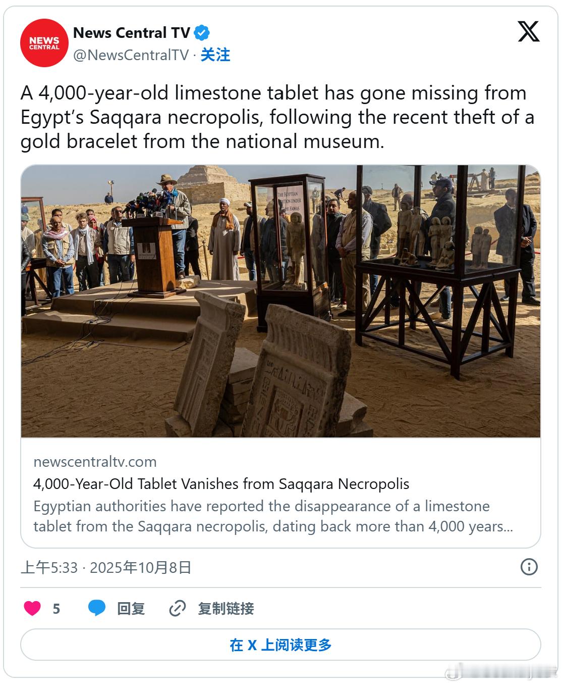 图:埃及当局5日证实,一幅拥有4000年历史的石灰岩壁画,从古墓内离奇失踪。 (图撷取自社群平台「X」)