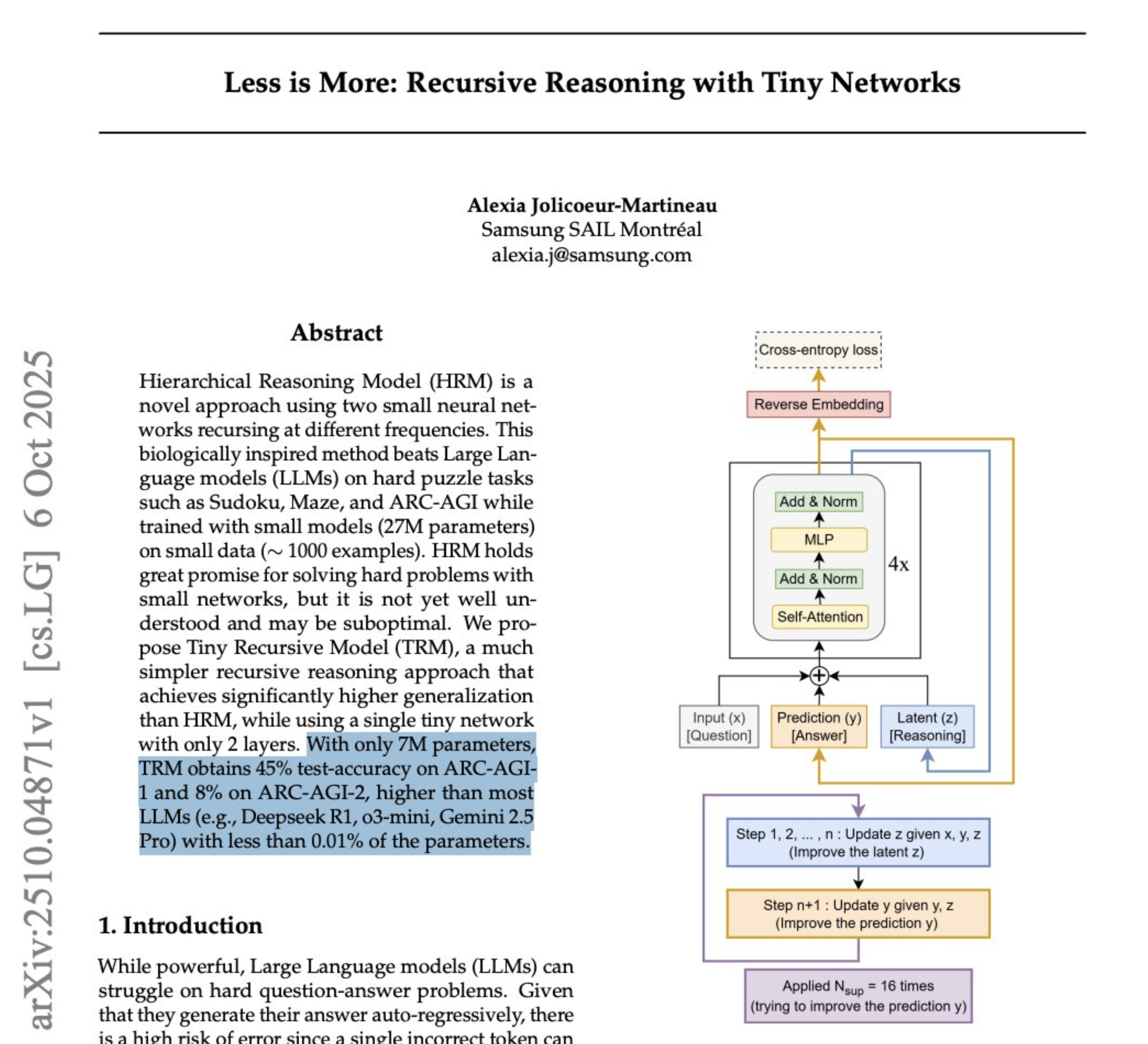 今天的AI热点新闻是三星搞出一个AI大模型,体积小1万倍的一个小小的 700 万参数模型在 ARG-AGI 1 和 ARC-AGI 2 的推理中击败了 DeepSeek-R1、Gemini 2.5 pro 和 o3-mini。它被三星称为“微型递归模型”(TRM)。