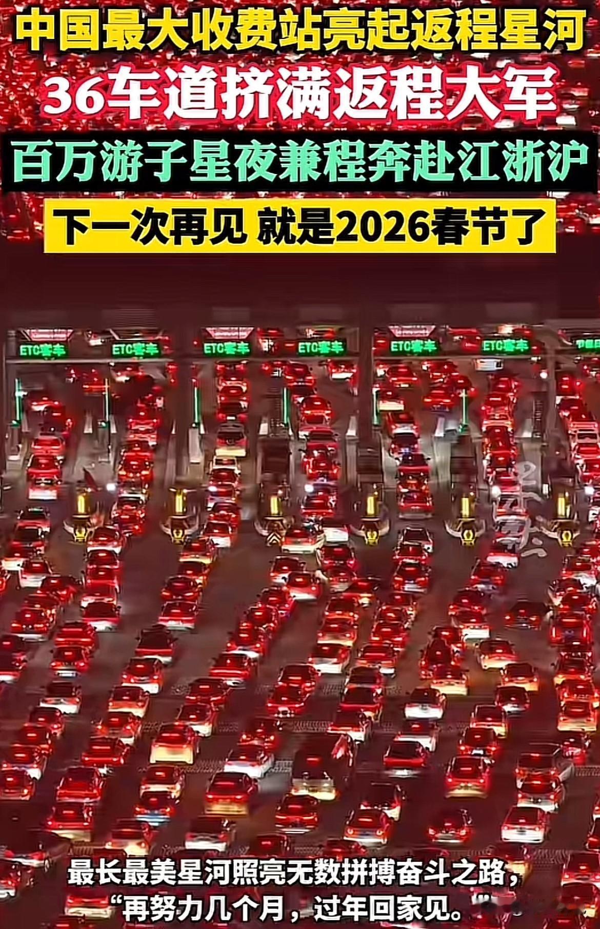 你见过“星河”在地面流淌吗? 中秋刚过,国庆返程潮就把安徽吴庄收费站变成了这样的奇观!36条车道被返程大军挤得满满当当,千万辆车的尾灯连成一片红色星河,这哪是堵车,分明是百万游子为生活奔赴江浙沪的热血征程啊! 这些星夜兼程的人,有的是为了职场拼搏,有的是为了给家人更好的生活。他们在这拥堵里,藏着对未来的期许,也藏着对家乡的不舍。下一次再见要等2026春节,这大半年的奋斗,就为了过年能好好团聚。 你有没有在这样的返程车流里奔波过?你觉得为了生活打拼,这样的奔波值得吗?来聊聊你的故事~