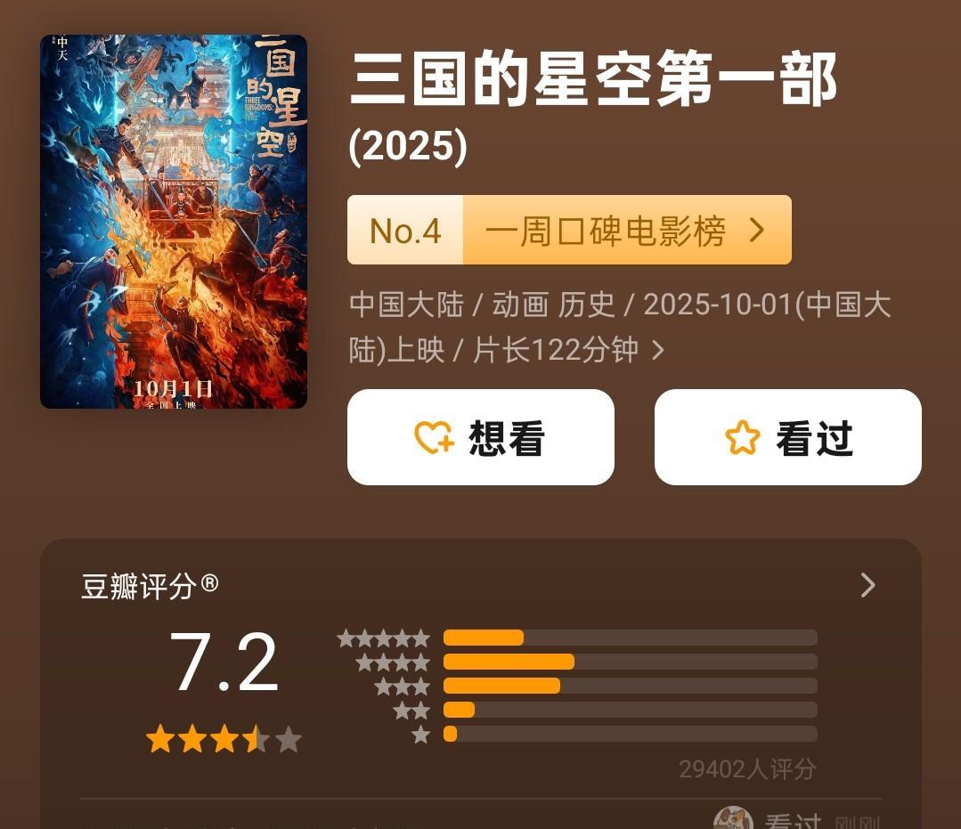 口碑7.2分,票房却仅有7400多万,《三国的星空》怕是不会有第二部了。 作为历