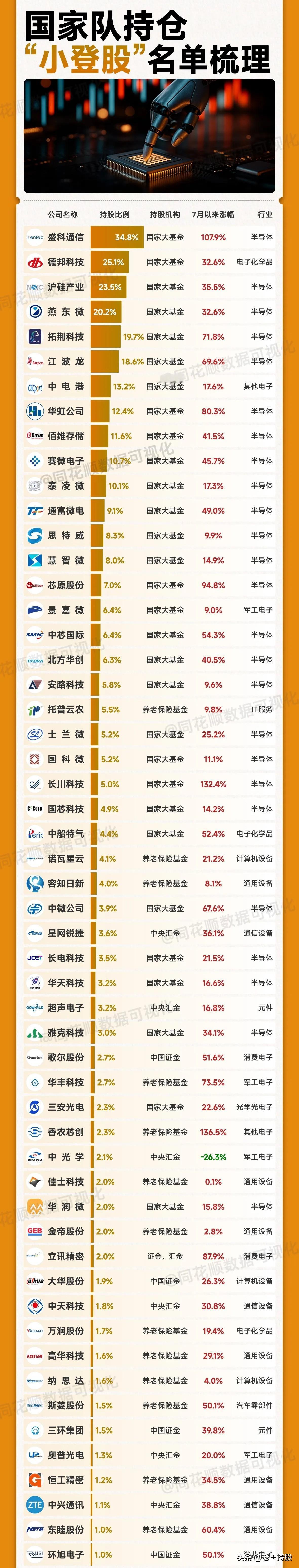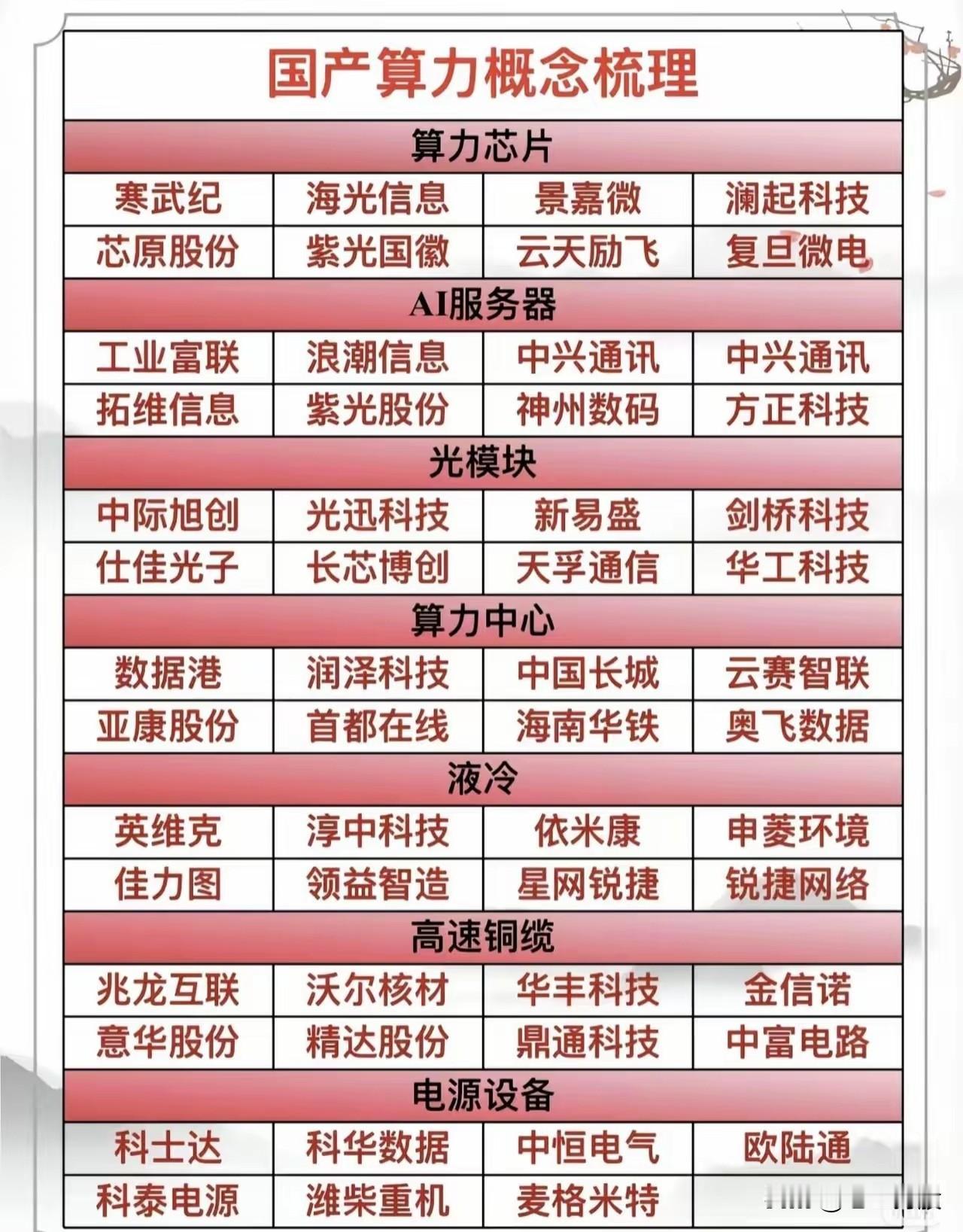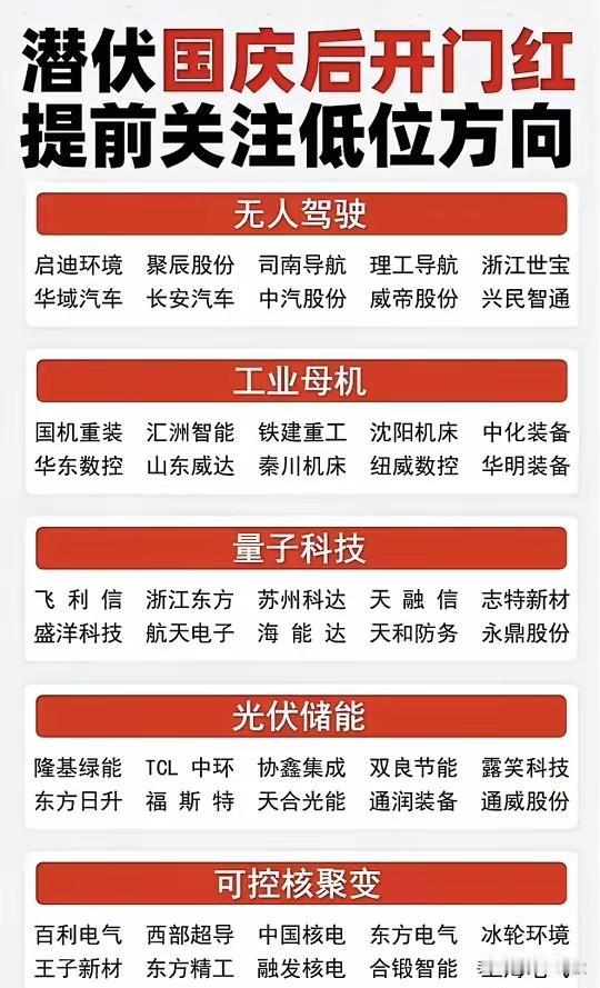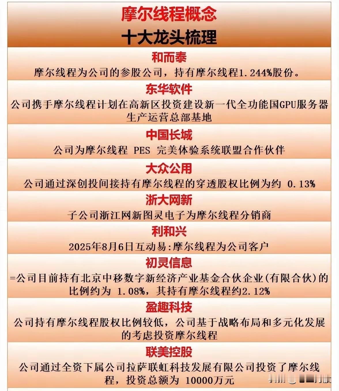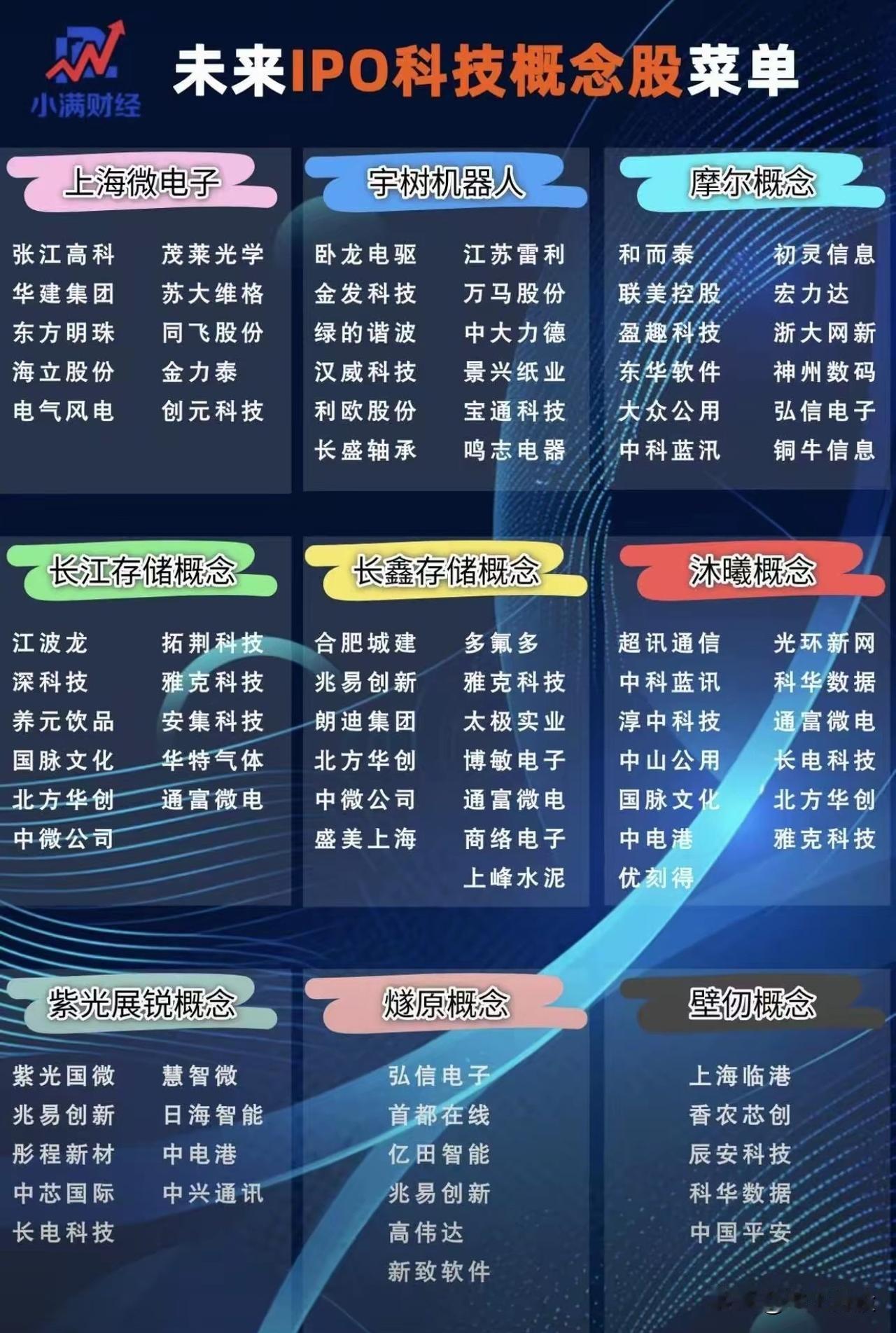 以下是对未来IPO科技、摩尔线程、国产算力相关概念股票信息的综合整理与分析: 一、【未来IPO科技概念股菜单】 - 主要科技概念及代表股票: - 上海微电子:张江高科、华建集团、东方明珠、海立股份、电气风电、茂莱光学、华大维格、同飞股份、金力泰、创元科技 - 长江/长鑫存储概念:江波龙、深科技、养元饮品、国脉文化、北方华创、中微公司、紫光展锐概念(如慧智微、兆易创新、日海智能、彤程新材、中芯国际、长电科技、紫光国微、弘信创新、中电港) - 蔚来概念:中兴通讯 - 其他重复提及热点:中芯国际、长电科技、紫光国微、芯国际(可能为中芯国际笔误)、蔚来概念、中兴通讯等 🔍 特点:信息图以科技感视觉设计呈现,将热门科技IPO概念进行分类,每类下给出关联A股上市公司,便于投资者追踪产业链布局。 二、【摩尔线程概念十大龙头梳理】 - 主题:聚焦国产GPU新势力——摩尔线程,梳理与其有深度合作、持股或战略关系的十大龙头企业。 - 主要公司及关系: - 和而泰:持有摩尔线程1.244%股份 - 东华软件:携手摩尔线程,拟共建GPU服务器生产基地 - 中国长城:摩尔线程PES完美体验系统联盟合作伙伴 - 大众公用:通过深创投间接持有约0.13%股权 - 浙大网新:子公司为摩尔线程分销商 - 利和兴、初灵信息、盈趣科技、联美控股等:均为摩尔线程客户或投资人(直接或通过基金间接持有) 🔍 亮点:突出国产GPU生态圈构建,涉及持股、合作、分销等多元关联,适合关注国产算力与芯片自主可控方向的投资者。 三、【国产算力概念梳理】 - 细分领域与代表企业: - 算力芯片:寒武纪、海光信息、景嘉微、澜起科技、芯原股份、紫光国徽、云天励飞、复旦微电 - AI服务器:工业富联、浪潮信息、中兴通讯、拓维信息、紫光股份、神州数码、方正科技 - 光模块:中际旭创、光迅科技、新易盛、剑桥科技、仕佳光子、天孚通信、华工科技等 - 算力中心/液冷/高速铜缆/电源设备:数据港、英维克、中富电路、科士达、科华数据、兆龙互联、沃尔核材等 🔍 价值:覆盖从芯片、服务器、传输、冷却到供电的完整算力基础设施链条,是研究国产AI与算力自主化的重要参考。 四、【国家队持仓“小登股”名单梳理】 - 主题:披露“国家队”(如国家大基金、养老保险基金、中央汇金等)在科技类尤其是半导体公司中的重仓情况。 - 重点信息包括: - 盛科通信:国家大基金持股34.8%,7月以来涨幅107.9% - 沪硅产业、中芯国际、北方华创、拓荆科技、江波龙、芯原股份、景嘉微、中微公司等半导体龙头均获大基金高比例持股(普遍在5%~34%之间),且部分个股涨幅惊人(如长川科技+132.4%、芯原股份+94.8%) - 持股机构还包括:养老保险基金、中国证金、中央汇金等 - 行业集中于:半导体、电子化学品、军工电子、IT服务、通信设备等 🔍 解读:国家资金高度聚焦硬科技,特别是半导体全产业链,且重仓股大多表现优异,具备较强的政策与资金双重驱动逻辑。 五、【潜伏国庆后开门红·低位方向投资建议(一)】 - 主题:节后投资策略,推荐关注“低空经济、深海科技、商业航天”三大方向低位潜力股。 - 主要板块与代表公司: - 低空经济:蓝黛科技、万向钱潮、隧道股份、天汽模、中交设计、绿能慧充、四川长虹、纵横通信、万丰奥威、科瑞技术 - 深海科技:四方股份、泰胜风能、亚星瞄链、海利得、中集集团、神开股份、中海达、海兰信、力合科技 - 商业航天:利君股份、航天科技、富瑞特装、中航高科、航天发展、航天电子、天奥电子、烽火电子、飞亚达、雷科防务 🔍 定位:聚焦国家战略性新兴行业,挖掘节后可能存在补涨或政策催化机会的“低位”标的,适合中长线布局。 六、【潜伏国庆后开门红·低位方向投资建议(二)】 - 主要板块与代表公司: - 无人驾驶:启迪环境、聚辰股份、司南导航、理工导航、浙江世宝、华域汽车、长安汽车、中汽股份、威帝股份、兴民智通 - 工业母机:国机重装、汇洲智能、铁建重工、沈阳机床、中化装备、华东数控、山东威达、秦川机床、纽威数控、华明装备 - 量子科技:飞利信、浙江东方、苏州科达、天融信、志特新材、盛洋科技、航天电子、海能达、天和防务、永鼎股份 - 光伏储能:隆基绿能、TCL中环、协鑫集成、双良节能、露笑科技、东方日升、福斯特、天合光能、通润装备、通威股份 - 可控核聚变:百利电气、西部超导、中国核电、东方电气、冰轮环境、王子新材、东方精工、融发核电、合锻智能、上海电气