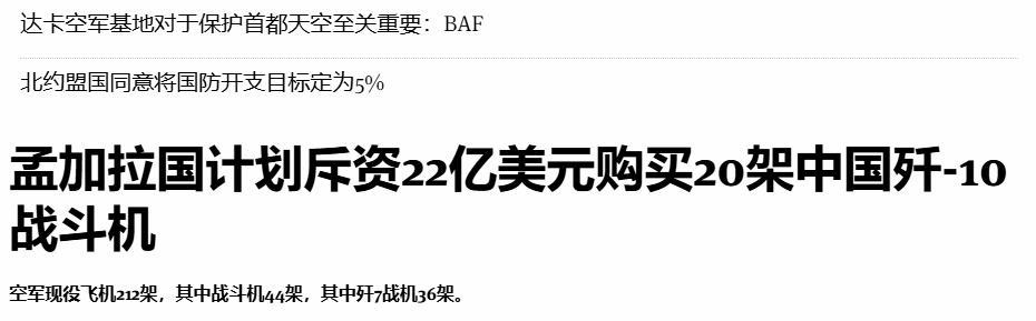 歼-10出口孟加拉似乎有戏? 与之前网传的各种“伊朗或印尼要买歼-10”捕风捉影消息相比,这回孟加拉媒体给出了更确切的采购时间表:孟加拉政府准备在2027年之前推动采购20架歼-10战机的计划。 预计交易金额为22亿美元,包括总价格12亿美元的机队、8.2亿美元的培训、维护和设备费,以及其他的保险、土建工程和代理佣金等费用。 考虑到自身经济状况,孟加拉方面希望用分期付款的方式购买这批战机,即将付款分为10个财政年,到2035或2036财年支付完所有款项。 如果孟加拉政府能落实其媒体爆料的这一时间表,对于印度来说,这可能是最糟糕的消息。 虽然孟加拉在南亚地缘政治上经常奉行亲印立场,但孟加拉与印度的利益并不是完全一致,特别是在水资源分配、贸易等问题上,而且印度经常会找借口干涉孟加拉内政,引发孟加拉国内民族情绪反感。 因此,如果孟加拉能买到歼-10,到时候印度必然将落入歼-10的“包围网”。