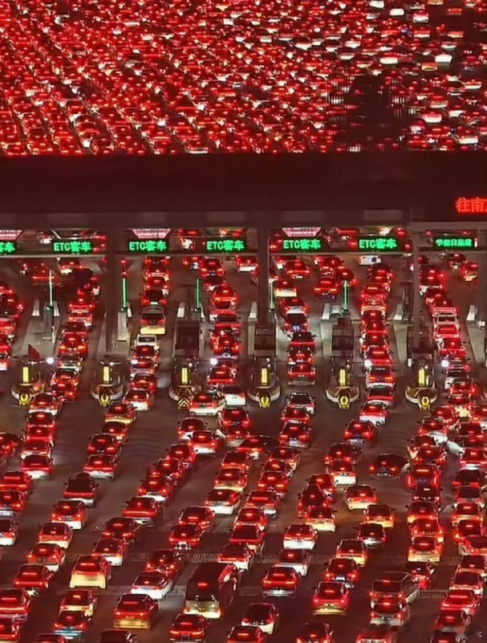 2025年10月7日(国庆返程高峰),安徽吴庄收费站双向36车道全开仍被车流填满。夜幕下车灯绵延数公里,航拍画面中形成“红色星河”或“发光长龙”,网友称其为中国基建的“硬核浪漫”。