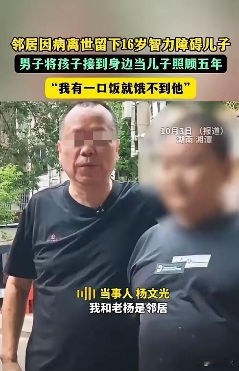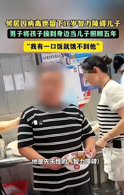 “重情重义!”湖南,52岁男子临终前,将16岁的智力障碍儿子托付给自己的挚友,而挚友为了让男子走的安心,拍着胸脯保证:“只要有我一口饭吃,就不会让他饿着!”转眼5年过去,现在孩子的变化让人泪目! 德州10月7日报道,杨先生和挚友熊先生是从小一起光着屁股长大的邻居,感情比亲兄弟还亲,熊先生的人生很苦,儿子小熊一出生就被诊断出有智力障碍,心智永远停留在了孩童时期。 这五年啊,熊先生是真把小熊当亲儿子养。早上六点准起,熬小米粥拌点碎青菜,怕小熊咬不动馒头。 专门买的手工软馍。以前杨哥在世时,俩老爷们儿总蹲楼下抽烟唠嗑,现在熊先生推着小熊坐小区石凳。 教他认树上的麻雀、地上的蚂蚁洞。小熊说话还是含糊,但最近突然能喊出“熊爸”了,熊先生躲在厨房抹眼泪,说比当年杨哥拍他肩膀说托付时还激动。 社区网格员说,熊先生每月领的低保金本就紧巴,可小熊的康复训练费他从来没省过。 有人劝他把孩子送福利院,熊先生脖子一梗:“杨哥走前抓着我手掉泪,我要是松了口,他地下能安生? ”其实大家都明白,这种托付比血缘还沉——法律上熊先生没义务,全凭心里那股子“兄弟没走完的路我接着走”的劲儿。 可话说回来,全靠个人情分兜底多悬啊?要是熊先生哪天身体垮了,或者家里有变故,小熊该咋办? 咱们社会对特殊群体的保障能不能再扎实点?别总让这种“兄弟信义”扛下所有重量。 小熊现在会跟着熊先生去菜市场帮着递葱,看见熟人咧嘴笑,这些小变化里藏着多少人的心血?残障男孩 智力残疾人士 各位读者你们怎么看?欢迎在评论区讨论。