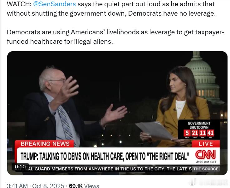 参议员伯尼·桑德斯终于把心里话说出来了——他承认,如果不让政府关门,民左党就没有任何筹码。