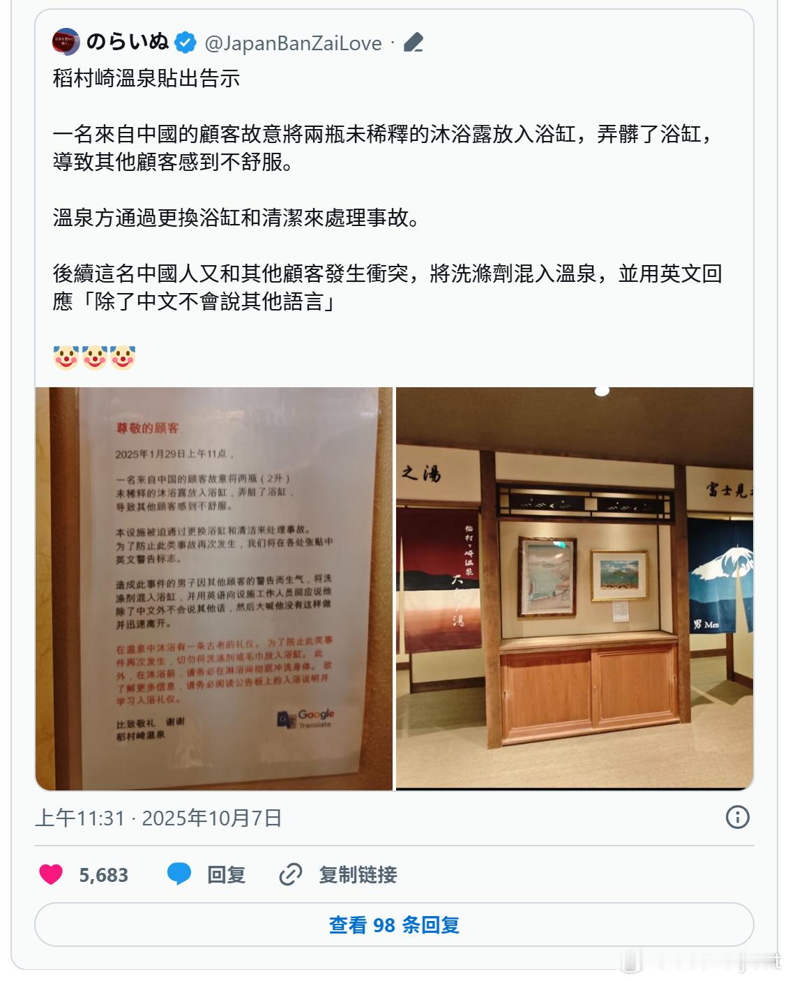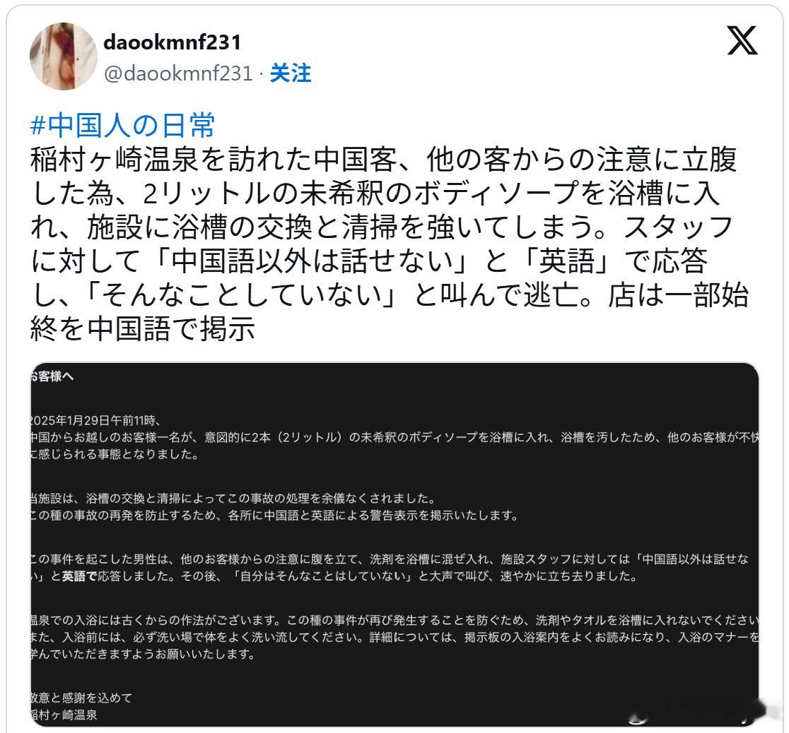 【中国男子怒倒两瓶沐浴乳污染浴池 镰仓知名温泉紧急停业清洗】海外新鲜事日本