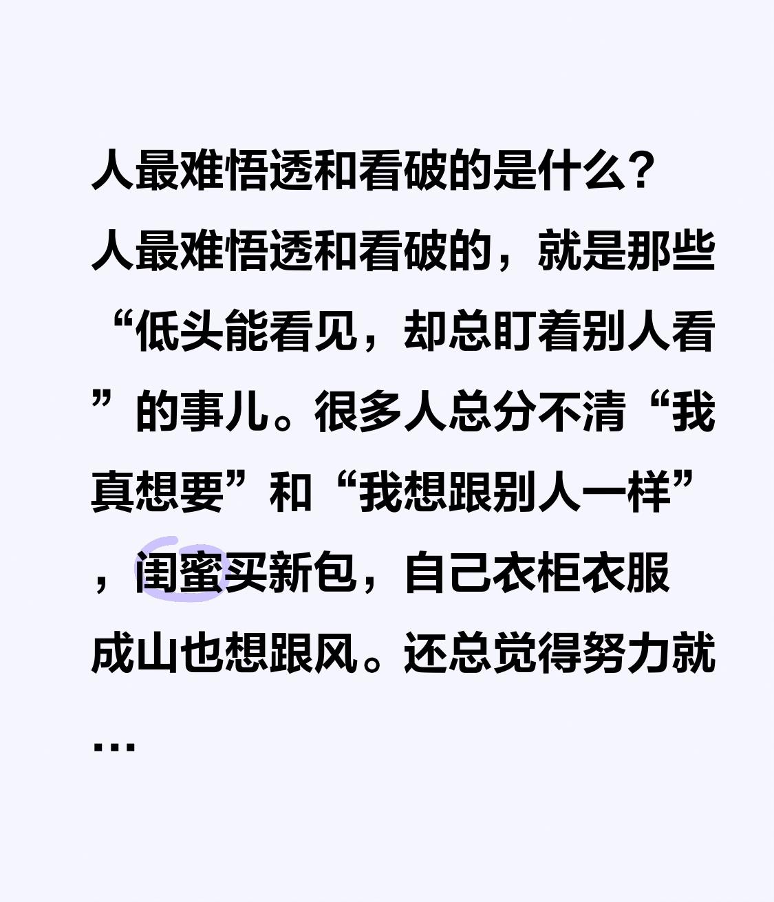 人最难悟透和看破的是什么? 人最难悟透和看破的,就是那些“低头能看见,却总盯着别人看”的事儿。很多人总分不清“我真想要”和“我想跟别人一样”,闺蜜买新包,自己衣柜衣服成山也想跟风。 还总觉得努力就得马上有回报,减肥三天没掉秤就吃火锅,理财一周没涨就割肉,却忘了好成果需要时间沉淀。 另外,总看不透别人的好都是有滤镜的。看到同事朋友圈的度假美照,就觉得人家爽,没看到人家此前的加班;羡慕同学当老板,却不知其背后的愁闷。其实,别拿自己日常对标别人高光,日子是自己的,自己碗里饭也香。 看懂人性真相 要看透人心