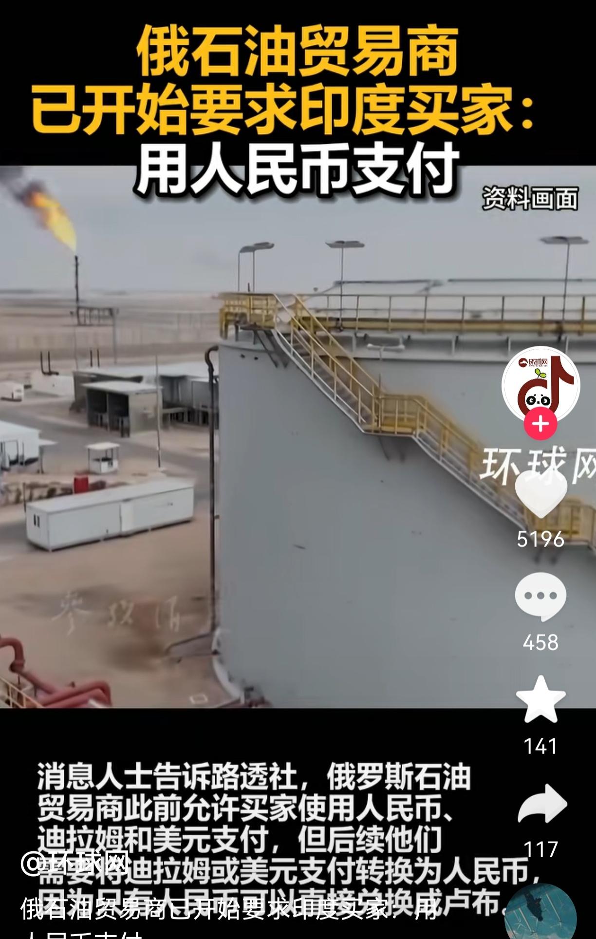 印度最近用人民币买俄罗斯石油的事儿,在国际上挺受关注的。 俄罗斯石油贸易商现在要求印度国有炼油厂用人民币支付,说是人民币能直接换卢布,省得用迪拉姆或美元再转,流程简单。 之前印度石油公司试过用人民币,但中印关系紧张那会儿停了,现在关系缓和又开始用,最近已经付了两三批货的钱。 印度为啥愿意这么干? 俄罗斯石油便宜啊,每桶比沙特便宜近10美元,比美国低5块多。 印度石油90%靠进口,买俄油一年能省近170亿美元,这钱对印度经济挺重要的,就算美国加税施压,也舍不得放弃。 你说这事儿,印度为了省成本用人民币买俄油,美国再怎么施压,能拦得住吗?