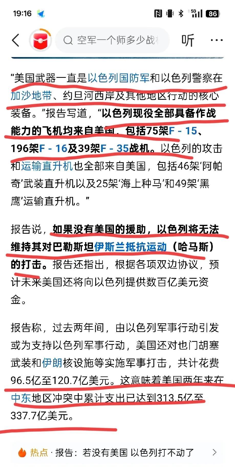 看了报道,现在才知道,哈马斯不是和以色列国防军在打仗而是和老美在打仗啊! 看来哈马斯在和世界老大再打仗吧,怪不得那么吃力,报道还说,如果没有美国的援助,以色列将无法维持其对巴勒斯坦哈马斯的打击。 怪不得胡塞武装一直袭击美国的船只,船上都是支持以色列的武器装备啊。