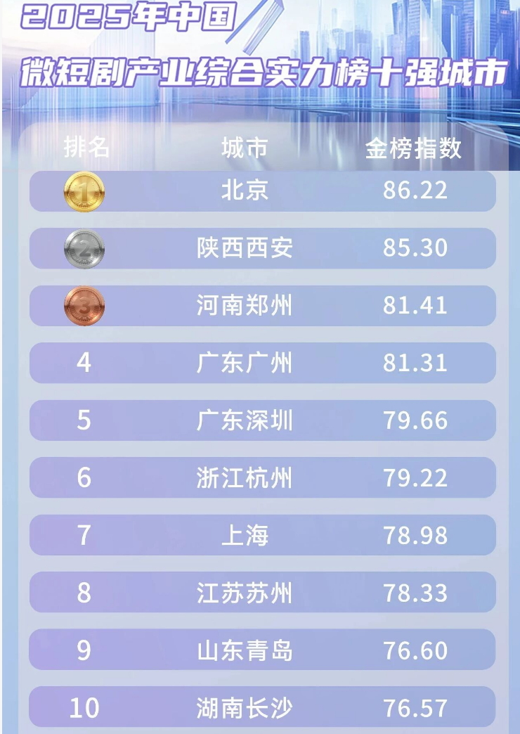 从吃流量的网络快消品升级为数字文娱产业的重要细分赛道,微短剧正成为众多城市的竞争焦点,专业机构评出的微短剧产业十强从高到低分别是北京、西安、郑州、广州、深圳、杭州、上海、苏州、青岛和长沙。 一线城市悉数在列,以娱乐产业闻名的城市也大多入选。其中西安与郑州紧追北京位列三甲,这两座北方城市都在针对微短剧领域频频发力,争当“微短剧之都”。倒是未入十强、狠起来为了游戏产业能对“自家老辈子”动手的成都,正在一旁默默憋大招。 微短剧产业有多香?千亿产值、百万就业岗位的潜力 微短剧并非横空出世,但让其广泛进入大众视野并引发热议的,并不是离奇剧情和飙升的流量,而是硬核的产业数据。 2024年微短剧市场规模超过500亿元,已高于走下坡路的国内电影票房,在未来三年微短剧市场有望突破千亿,用户规模接近10亿。仅今年上半年,微短剧产业就新增了超过50万个就业机会,完全可以轻松容纳百万打工人。而且,微短剧的观众覆盖全年龄段,对就业人口的吸纳却是以年轻人为主。 与国内影视剧质、量全面下滑不同,欣欣向荣的微短剧得到了顶层设计的肯定与支持,推动其内容与文旅、普法等领域深度融合,各地也相继出台扶持政策,尤其是对基地建设大力支持。多方影响之下,微短剧产品已经开始向精品化转型——流量要吃,品质也要升。 微短剧产业城市竞速,北京之下,西安、郑州的实力 目前的微短剧城市竞速,比拼的指标尚不够多,但也展现了该领域的白热化竞争程度。受益于头部平台集聚与资本雄厚,北京目前以年产值居首,但位居第二、三位的郑州和西安则代表了该领域头部引领、百花齐放的潜力。 郑州有产能规模,成本优势显著;西安有产业链效率,擅长内容精品化;杭州、广州有影视基础,走得是差异化路线。回过神来的成都,则开始在2025年密集出台政策和进行产业布局。 郑州和西安同为微短剧领域的城市优等生,但核心优势有很大的不同。 比如郑州的规模扩张,2024年末时全市微短剧制作企业超过800家,同比增长近30%,从业人员超过3万人,一年间增加数倍,每天有数十个剧组在赶工已经常态化,2025年上述数字还在稳稳增长。 为何郑州能如此之“卷”,郑州的群演日均工资只有横店的三分之一,房租、物价等拍摄成本明显低于各个一线城市和头部新一线城市,拍摄基地多,价格也不高,身处高铁圈核心跨区域取景调度效率也更高一些。郑州的劣势也比较明显,被专业和非专业人士共同吐槽“原创性不足”,自主IP孵化能力偏低,后期制作人才也存在缺口,内容升级问题亟待解决。 相比之下,在影视界赫赫有名的西安在微短剧领域也有意竖起“精品标杆”,“强冲突”“快节奏”的微短剧,对于专业属性拉满的西安,还真不是难题。西安的微短剧制作企业超过600家,产能提升的同时,爆款频出,还拿下了“年度微短剧上镜城市”称号。 西安同样拥有一些成本优势,还拥有全链条服务能力,在“微短剧+文旅”方面也走在了前面,冀望既提升内容质感,又带动景区流量。西安的短板是随着其他城市的崛起而逐步显露,微短剧“精品化”的保质保量对西安也是莫大的压力,本地人才也存在流失现象。 有《哪吒》的成都,想要慢工出细活? 郑州、西安酣战,而在文创、影视等领域实力强劲,擅长“流量+发展”全都要的成都在做什么? 成都也有着近500家微短剧相关企业,影视基础雄厚、文化资源丰富,有从影视产业高地转型微短剧新势力的坚实基础。成都今年以来密集推出的政策,要钱给钱,微短剧被纳入扶持体系,精品项目最高可拿千万补贴;要基地给基地,国际非遗博览园建成数万平方米的拍摄空间,计划年产百部;为保障剧本、IP的供应,成都促成西南F4和西藏一道发起“网络文学协同发展倡议”,为微短剧提供源源不断的IP素材。而且,作为西部数字经济重镇,成都在微短剧领域玩技术流也是专业的。 “微短剧之都”的竞争,本质上是对文化产业、数字产业、文旅产业的综合实力比拼,终究还是得落回“内容为王、生态制胜”。郑州和西安还将处于相持状态,成都要补的课还多。未来,得看哪一座城市率先诞生首个千亿级微短剧产业集群。